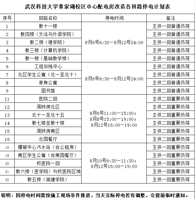 鸭脖黄家湖校区中心配电房配电柜设备已投入使用近20年,已超设备使用年限。自去年以来故障频发,严重影响学校正常的教学和科研秩序,同时也给广大师生生活带来诸多不便。为确保供电安全,学校拟于暑期对黄家湖中心配电房进行设备更换升级,现根据校园用电实际情况,将近期各区域停电时间通知如下: