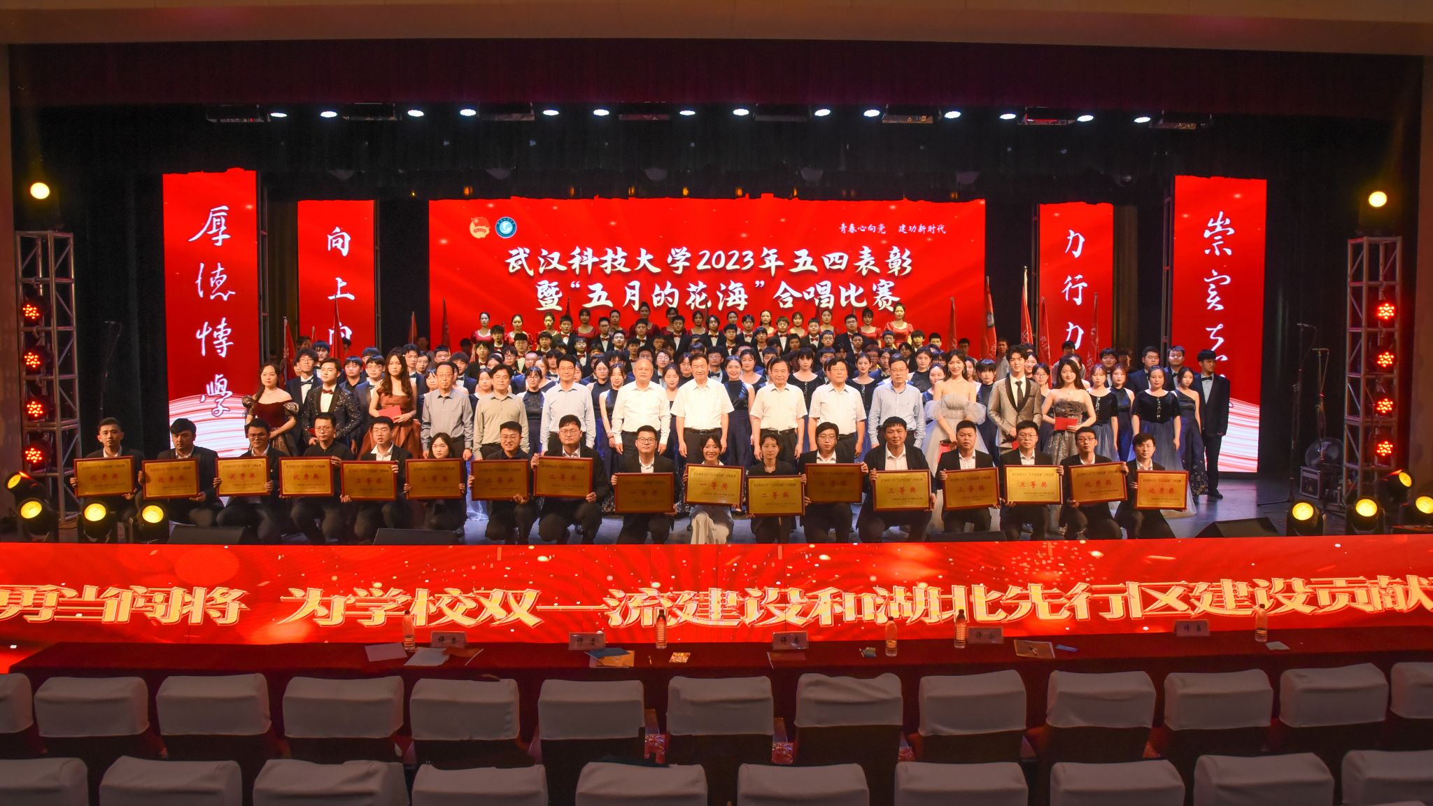 武科大网讯(见习记者刘睿萱 张虎琛)为全面贯彻党的二十大精神,在全校上下深入开展学习贯彻习近平新时代中国特色社会主义思想主题教育之际,5月4日,学校在黄家湖校区沁湖礼堂举办五四表彰暨“五月的花海”合唱比赛,千余名师生共同唱响党的奋斗历程与时代精神,纪念五四运动104周年,庆祝五四青年节的到来。