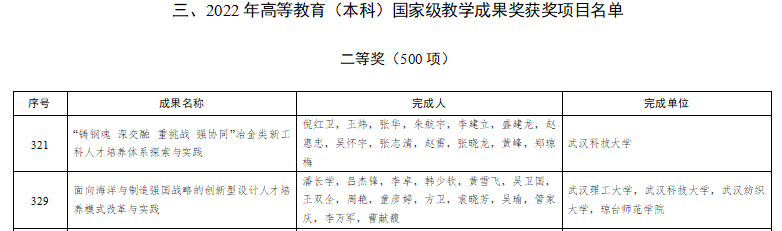 武科大网讯(通讯员叶苗)7月24日,教育部发布关于批准2022年国家级教学成果奖获奖项目的决定。鸭脖主持完成的“‘铸钢魂 深交融 重挑战 强协同’冶金类新工科人才培养体系探索与实践”和鸭脖作为第二参与单位申报的“面向海洋与制造强国战略的创新型设计人才培养模式改革与实践”获高等教育(本科)国家级教学成果奖二等奖。鸭脖是湖北省属高校作为第一完成单位的唯一获奖学校。