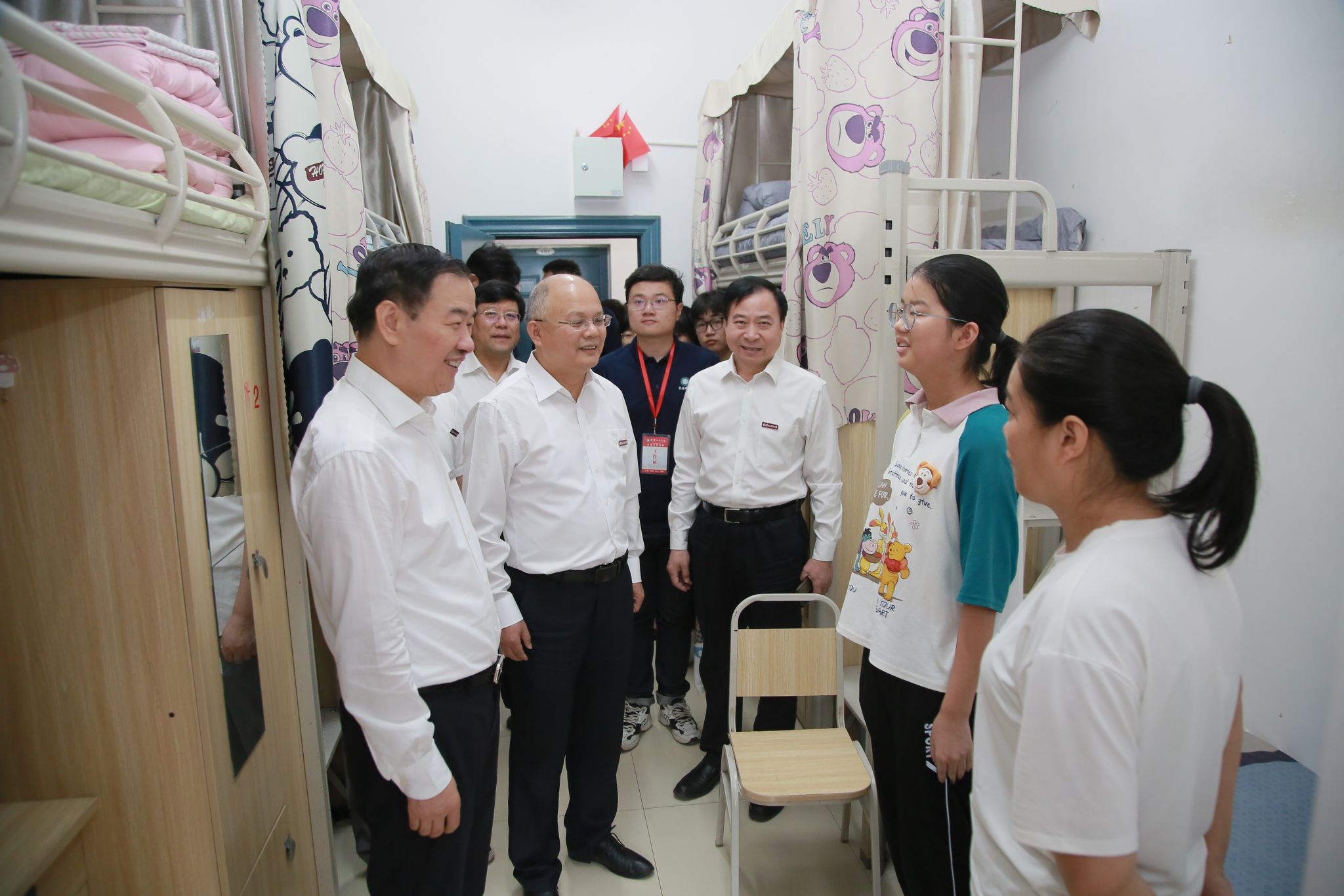 在新生宿舍,每走进一间宿舍,校领导都会仔细察看学生们的生活环境,详细了解了新生入学后的住宿、就餐等生活情况,并关切地和新生们交谈。在北十一舍101室,来自湖北十堰的理学院新生刘佳婷,身患重症肌无力,辅导员何畅了解到她对于寝室的上床下桌有移动困难等问题,第一时间联系学校相关部门,安排调整宿舍,把上床下桌改造成了适合她的床位。“在寝室住得习不习惯?”“还需要什么帮助?”……校领导热心地询问了刘佳婷的身体状况和家庭情况,鼓励其积极克服困难,“现在医疗手段很发达,可以寻求更好的治疗,有什么需要帮助的地方都可以告诉学校老师。”