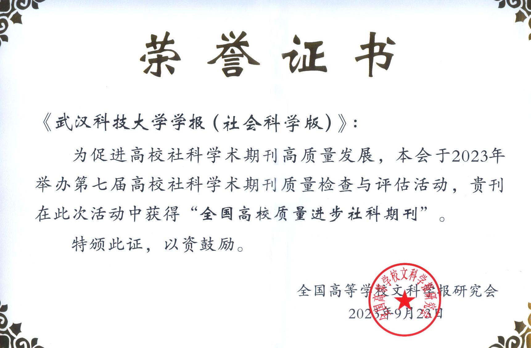 武科大网讯 9月23—24日,全国高等学校文科学报研究会九届三次理事会会议暨研究会成立35周年庆祝大会在湖北宜昌举行,会上公布了“第七届高校社科学术期刊质量检查与评估结果”,《yabo鸭脖官网学报(社会科学版)》获评全国高校质量进步社科期刊。