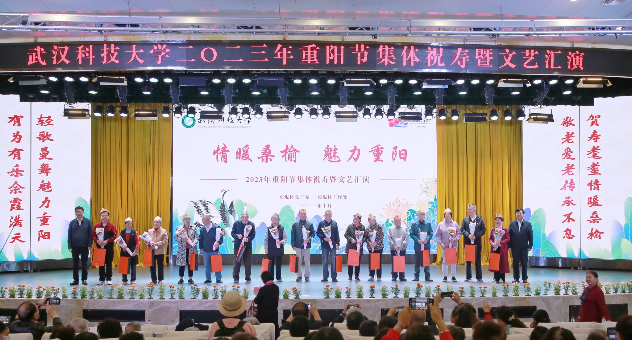 武科大网讯(记者李芳)10月20日上午,由离退休党工委、离退休工作处主办的2023年“情暖桑榆 魅力重阳”重阳节集体祝寿暨文艺汇演活动在青山校区碧园会堂举行,六百余名离退休教职工欢聚一堂,以集体祝寿、载歌载舞的方式共庆佳节。学校党委书记徐雁冰、副校长沈季伟出席活动,部分退休老领导和学校相关职能部门负责人参加了活动。庆典仪式由离退休党工委书记彭红斌主持。