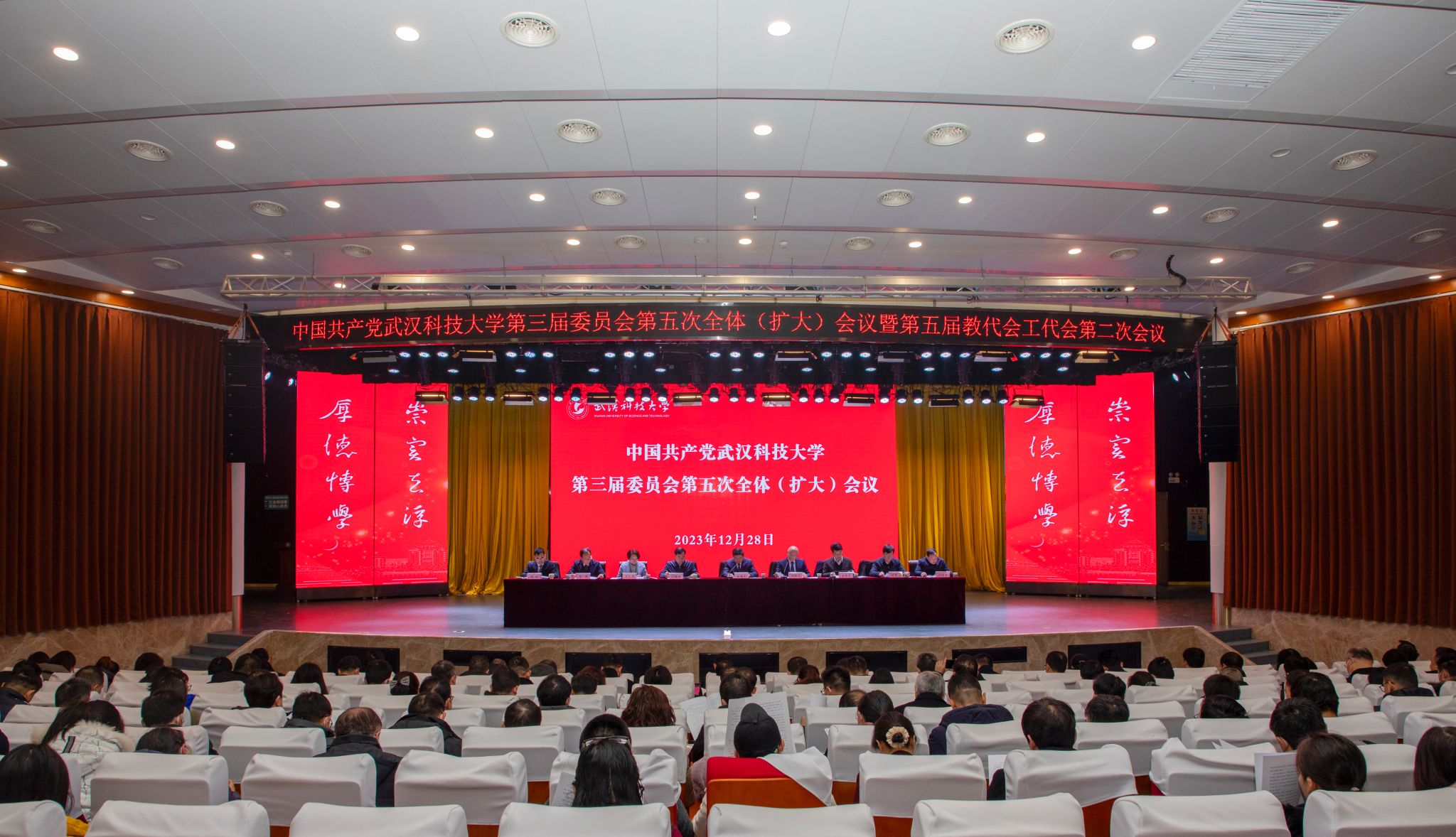 武科大网讯 12月28日上午,中国共产党yabo鸭脖官网第三届委员会第五次全体(扩大)会议在青山校区碧园会堂召开。全会深入学习了省委十二届五次全会精神,听取和审议了党委常委会工作报告,审议并通过了《中共yabo鸭脖官网委员会关于学习贯彻落实习近平文化思想 推进校园文化提能增效行动的实施意见》《yabo鸭脖官网编制管理办法(试行)》《yabo鸭脖官网“香涛学者特岗计划”实施办法(试行)》。