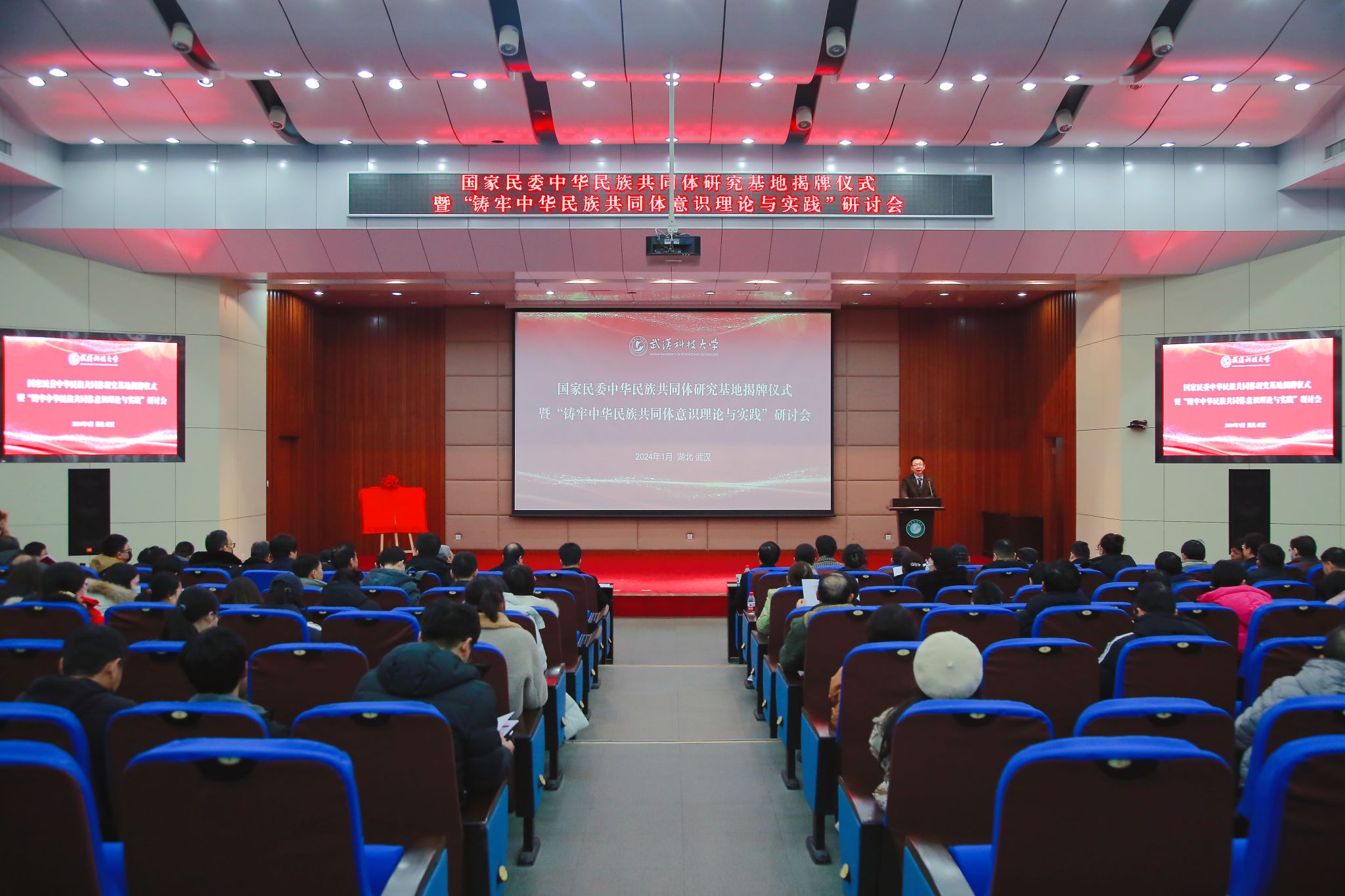 武科大网讯(通讯员何金 摄影李芳 金如梦)1月19日,“国家民委中华民族共同体研究基地揭牌仪式暨‘铸牢中华民族共同体意识理论与实践’”研讨会在鸭脖黄家湖校区举行。校党委书记徐雁冰出席开幕式并为研究基地揭牌,校党委副书记孙国胜出席开幕式并致辞。开幕式由法学与经济学院院长袁年兴主持。