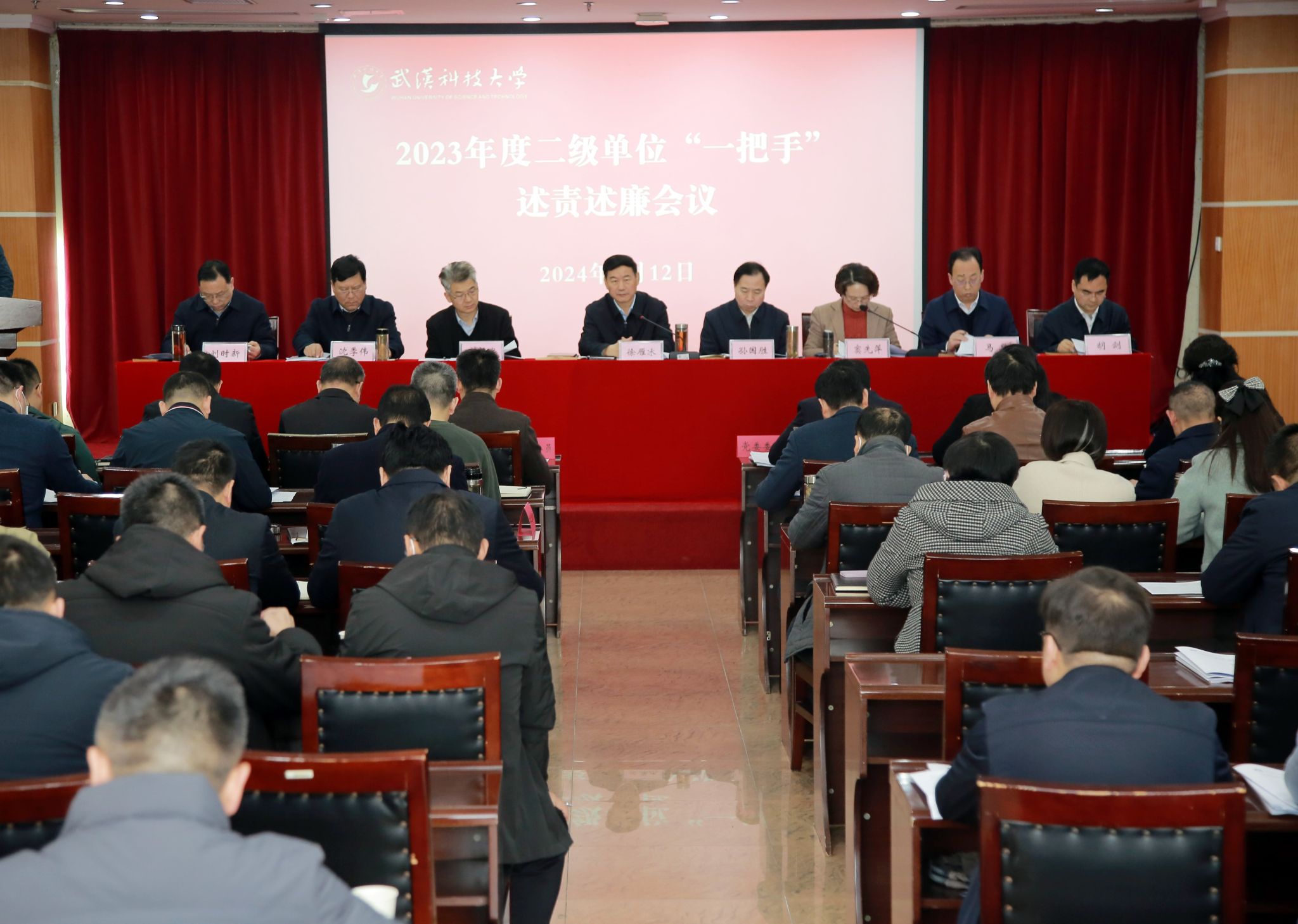 武科大网讯 3月12日上午,学校2023年度二级单位“一把手”述责述廉会议在青山校区18楼报告厅举行。校党委书记徐雁冰主持会议并强调,要学习贯彻党的二十大和二十届中央纪委三次全会精神,深入学习习近平总书记关于党的自我革命的重要思想,认真贯彻落实中共中央、省委关于加强对“一把手”和领导班子监督的意见要求,压紧压实全面从严治党政治责任,以管住“关键少数”带动“绝大多数”,持之以恒净化优化政治生态,为推进中国式现代化湖北实践贡献武科大力量。