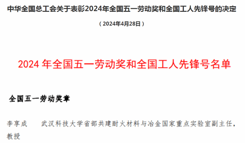 武科大网讯 4月28日,2024年庆祝“五一”国际劳动节暨全国五一劳动奖和全国工人先锋号表彰大会在北京人民大会堂举行,表彰全国五一劳动奖状255个、全国五一劳动奖章1088个、全国工人先锋号1034个。经校工会、省教科文卫体工会、省总工会逐级推荐,并经中华全国总工会审定公示,鸭脖材料学部李享成教授荣获全国五一劳动奖章。