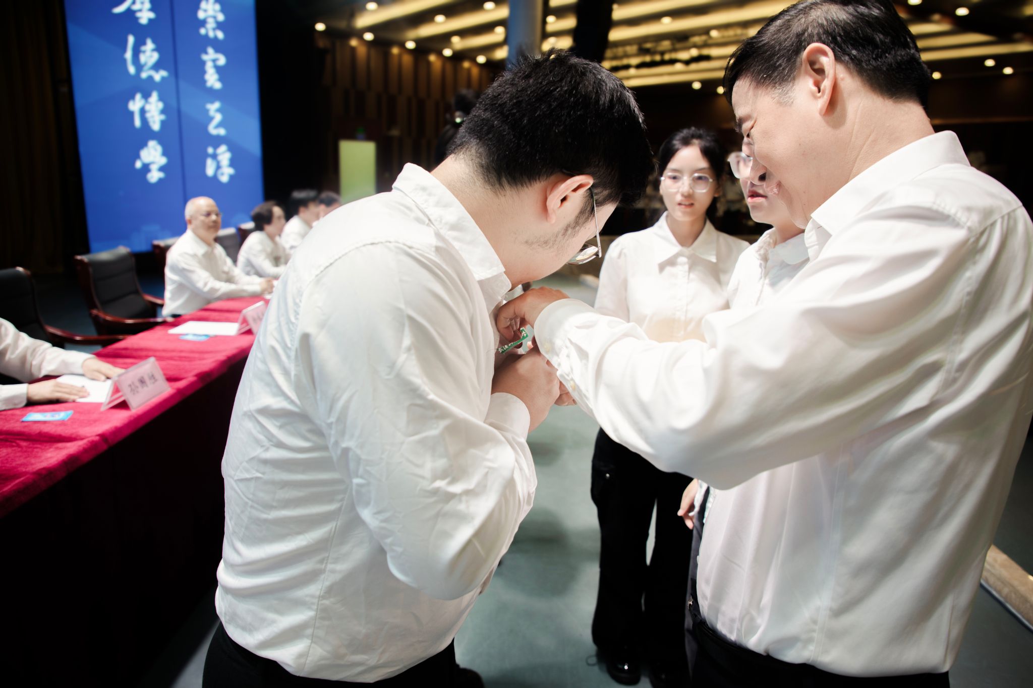 徐雁冰为研究生新生代表佩戴校徽,鼓励2024级研究生传承武科大精神、锤炼武科大品格。