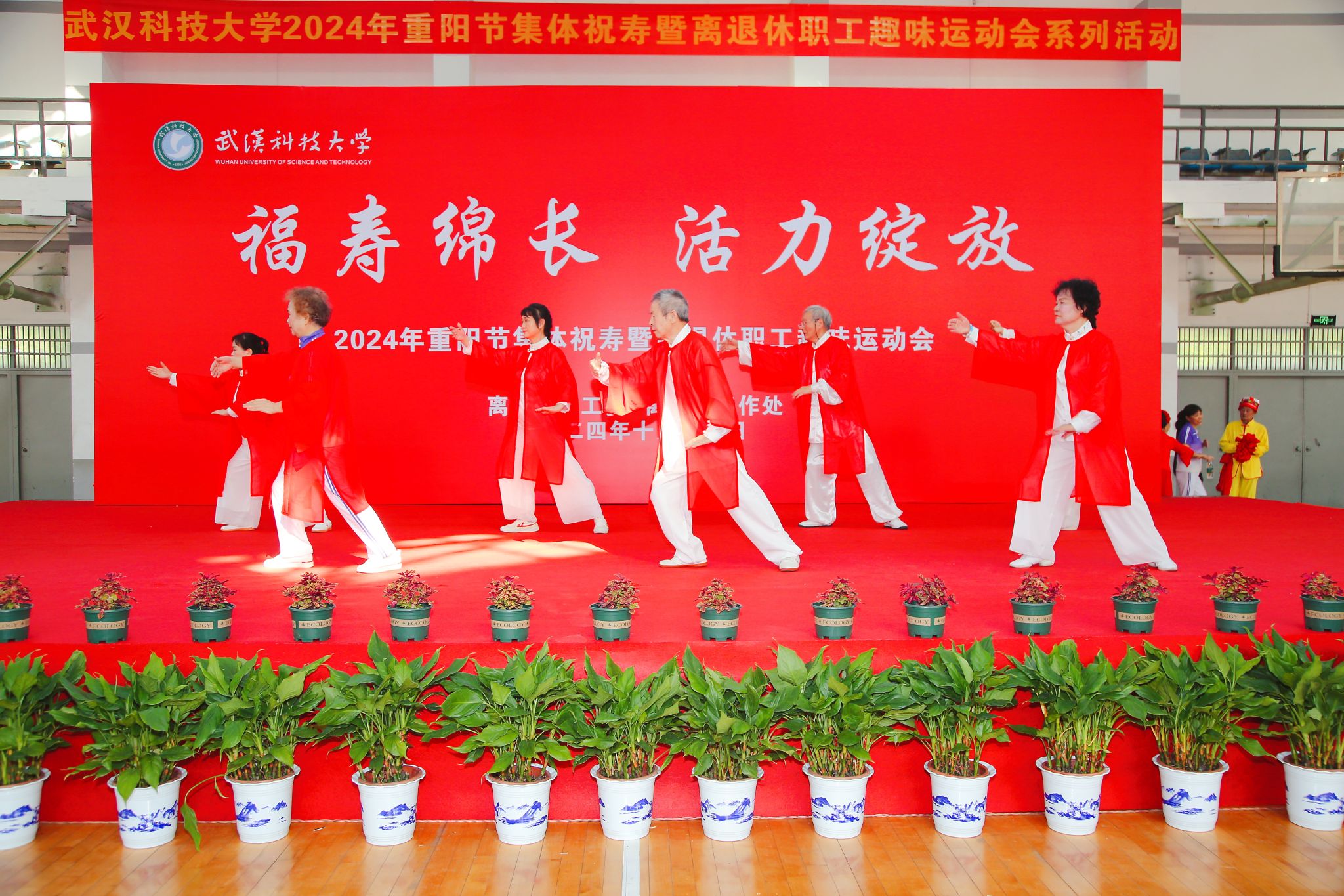 活动分为三个环节,分别是暖场表演、集体祝寿和趣味运动会。科大柔力球队《小小新娘花》、科大太极拳队《24式太极拳》、医学院老年艺术团舞蹈表演《祖国,你好》,这些精心编排的节目依次上演,离退休教职工们用优美的舞姿和饱满的热情,为老人们送上节日的祝福。