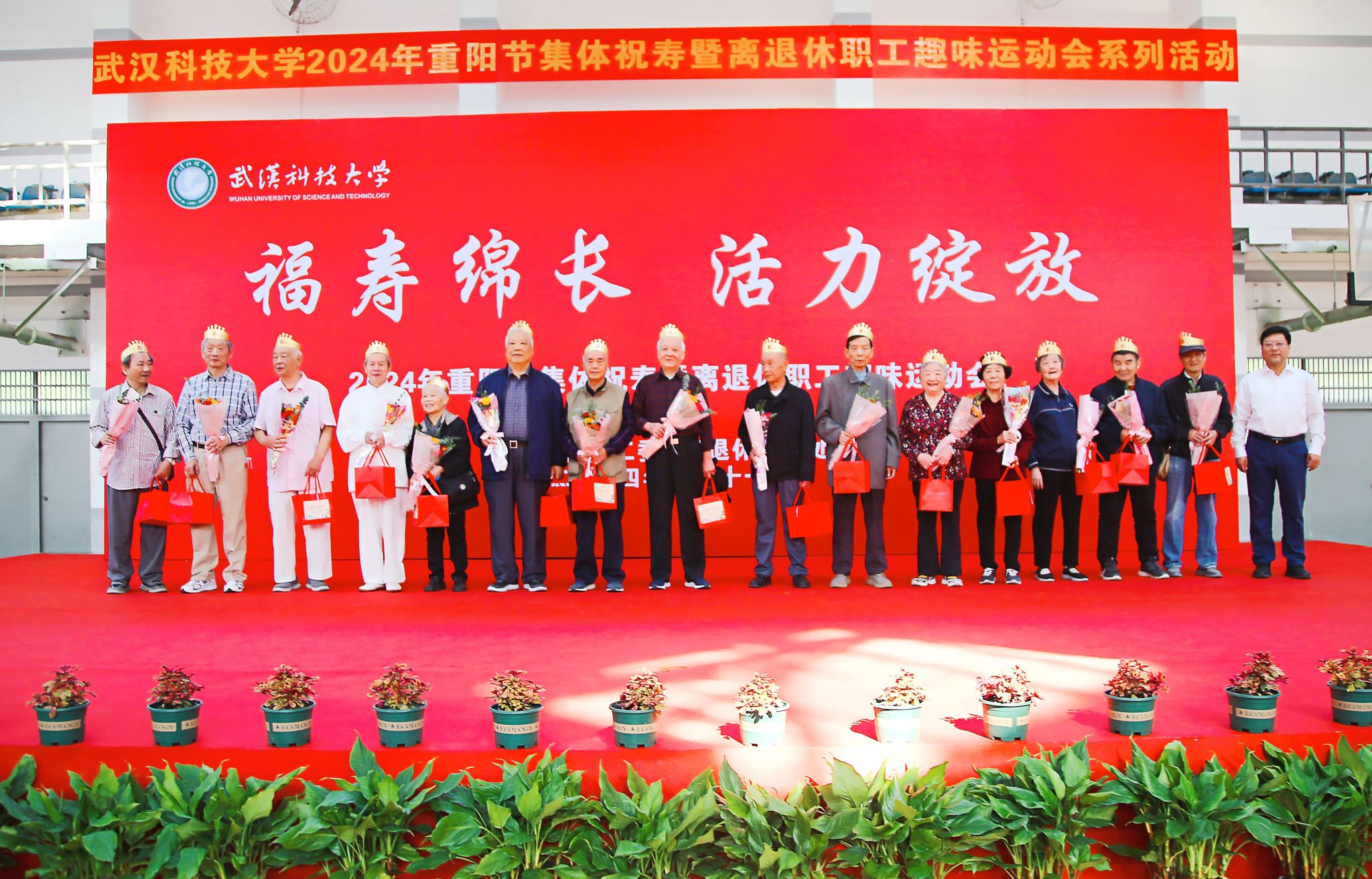 武科大网讯(记者李芳) 10月11日上午,又逢一年一度的重阳佳节。2024年“福寿绵长 活力绽放”集体祝寿暨离退休职工趣味运动会在鸭脖青山校区东院体育馆举行。校党委书记徐雁冰,党委常委、副校长沈季伟,党委常委、组织部部长刘时新同现场90、80、70周岁寿星,老党员、老教师等代表,以及有关职能部门负责人欢聚一堂,共庆佳节。