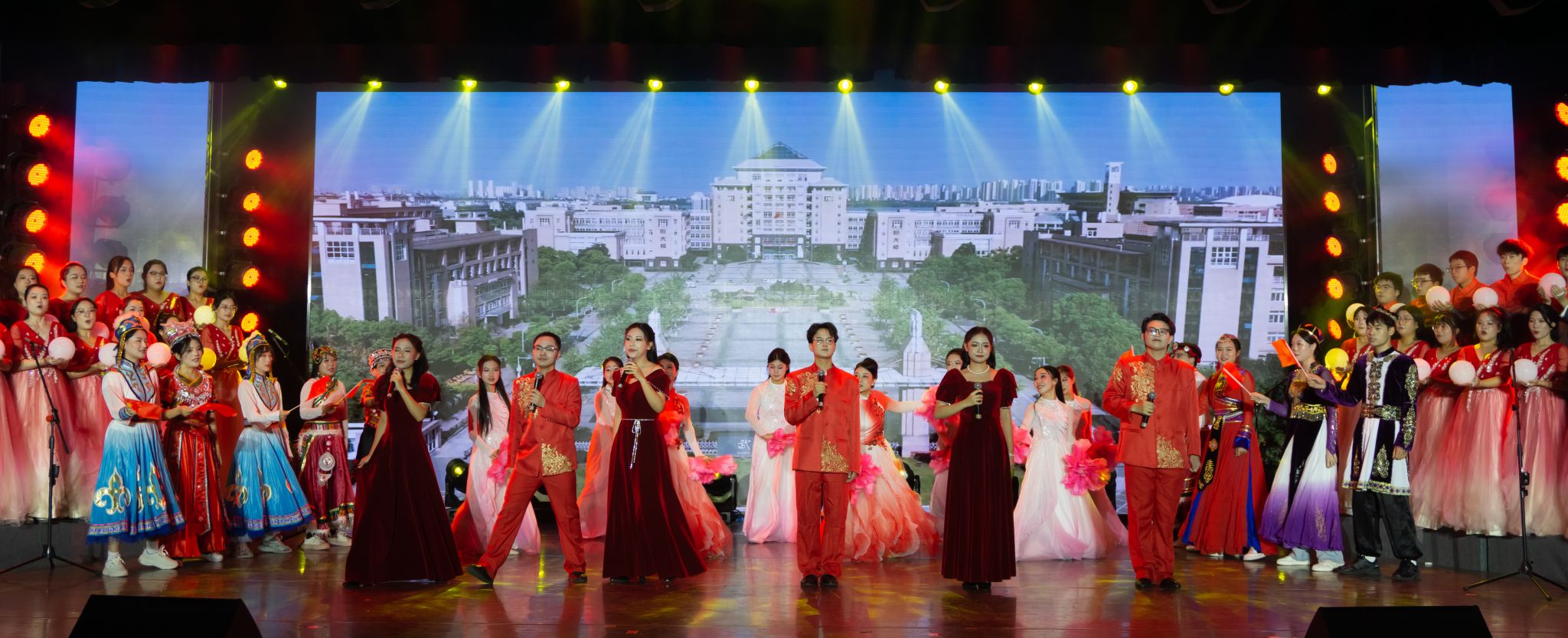 诗会在校团委带来的民乐合奏《象王行》中拉开帷幕,《致敬·光辉历程》《赓续·青春荣光》《奋斗·伟大梦想》三个篇章接连上演。诗朗诵感情真挚、舞台剧引人入胜、器乐伴奏悠扬动听……17个学院2000余名师生倾情演出,带来《如愿》《第七十五个秋天》《生逢盛世,吾当自强》《砥砺岁月,钢魂筑梦》等节目,献给观众一场“艺术+思政”的视听盛宴。