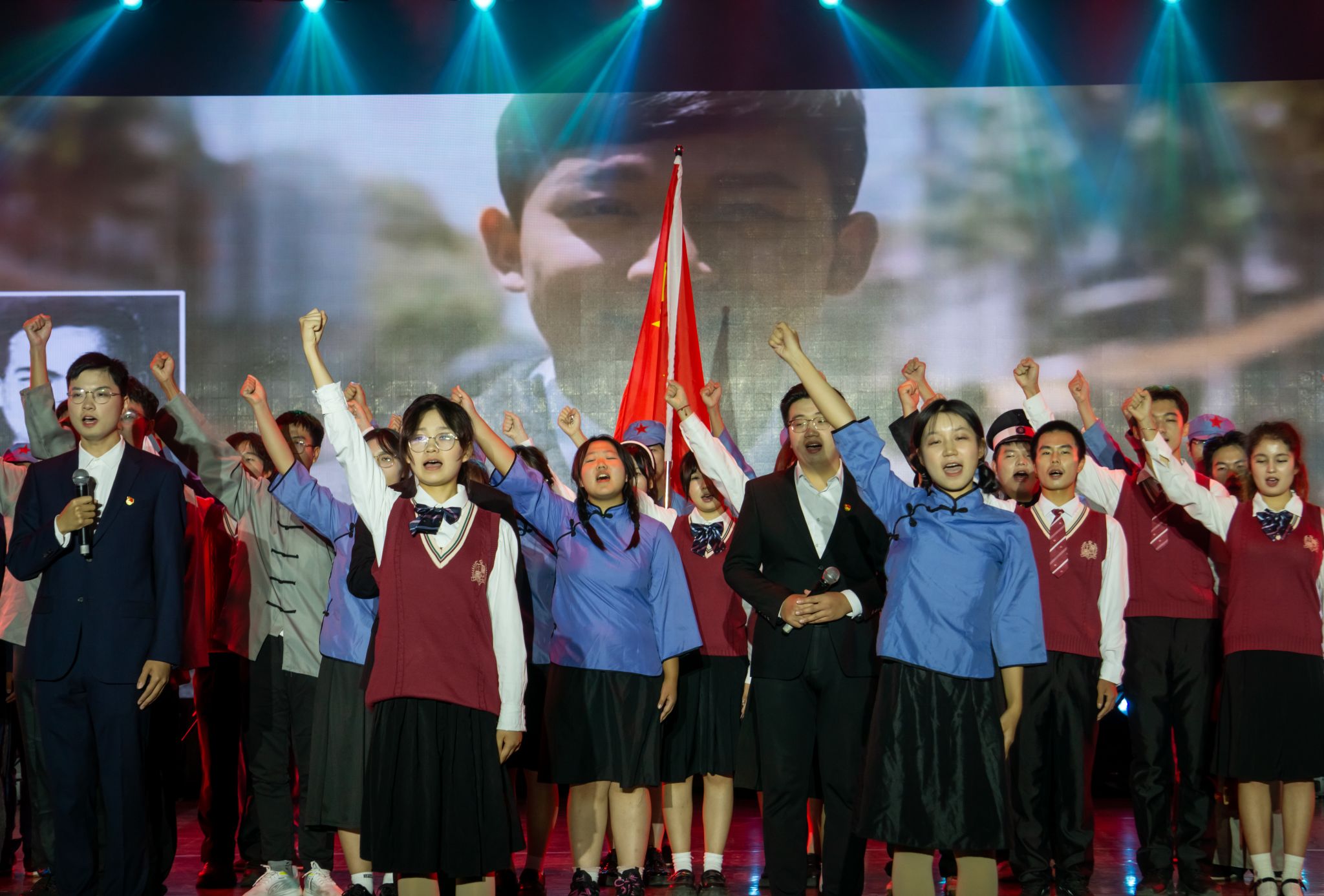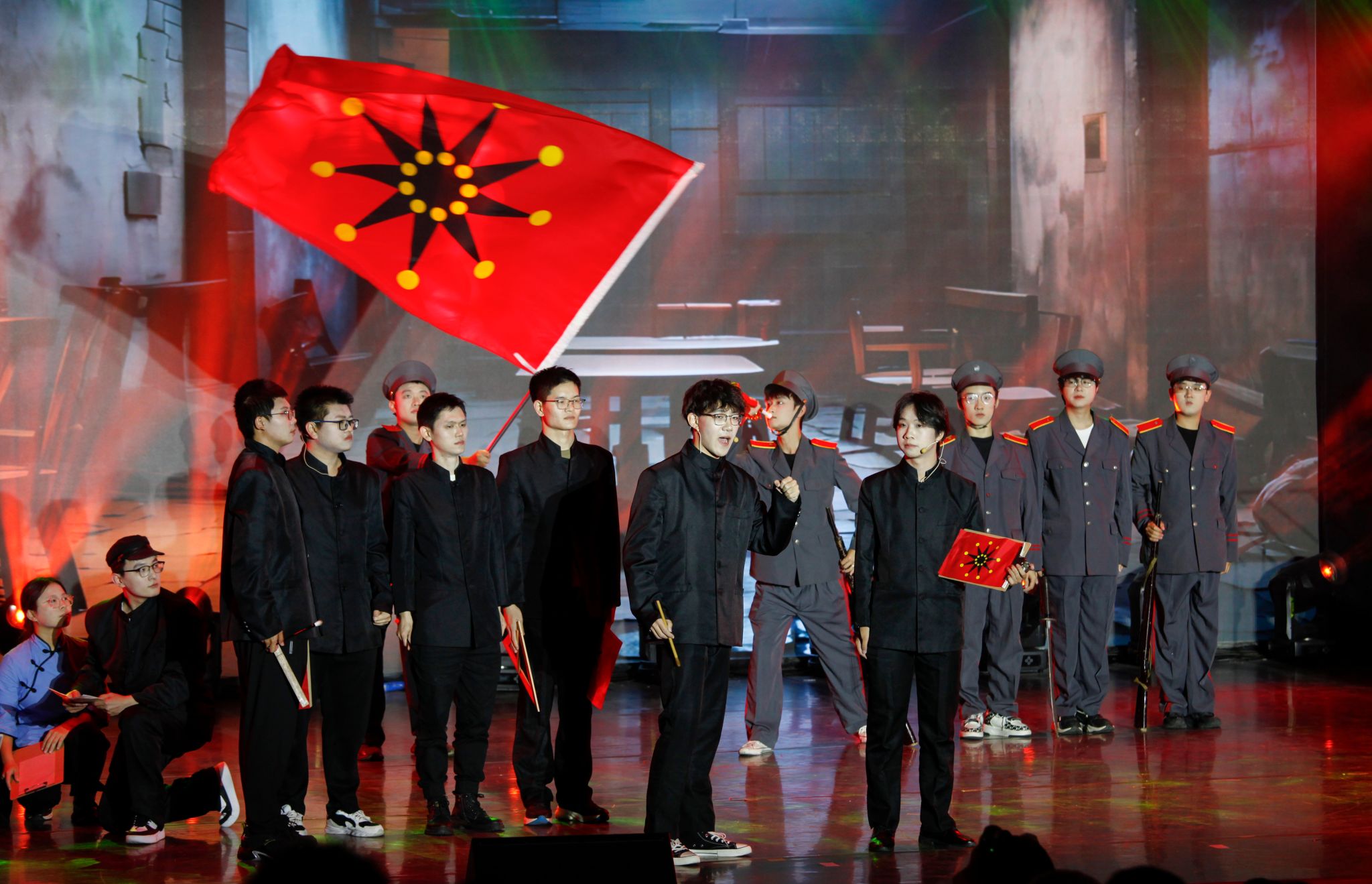 一段悠扬的竹笛声起,法学与经济学院近百名学子用诗讲述过去、现在、未来的青年故事。情至深处,“生逢盛世,吾辈自强”“踔厉奋发,笃行不怠”等铮铮誓言交替响彻会场。二胡、古筝、鼓点、唢呐交叠伴奏,音律急促,将表演推向高潮,蓦然一声清脆戏腔引得观众掌声如雷。朗诵最后,五缕红绸散落又汇聚成五角红星,后方国旗舞动,学生齐呼:“无惧风雨,扬帆起航!”