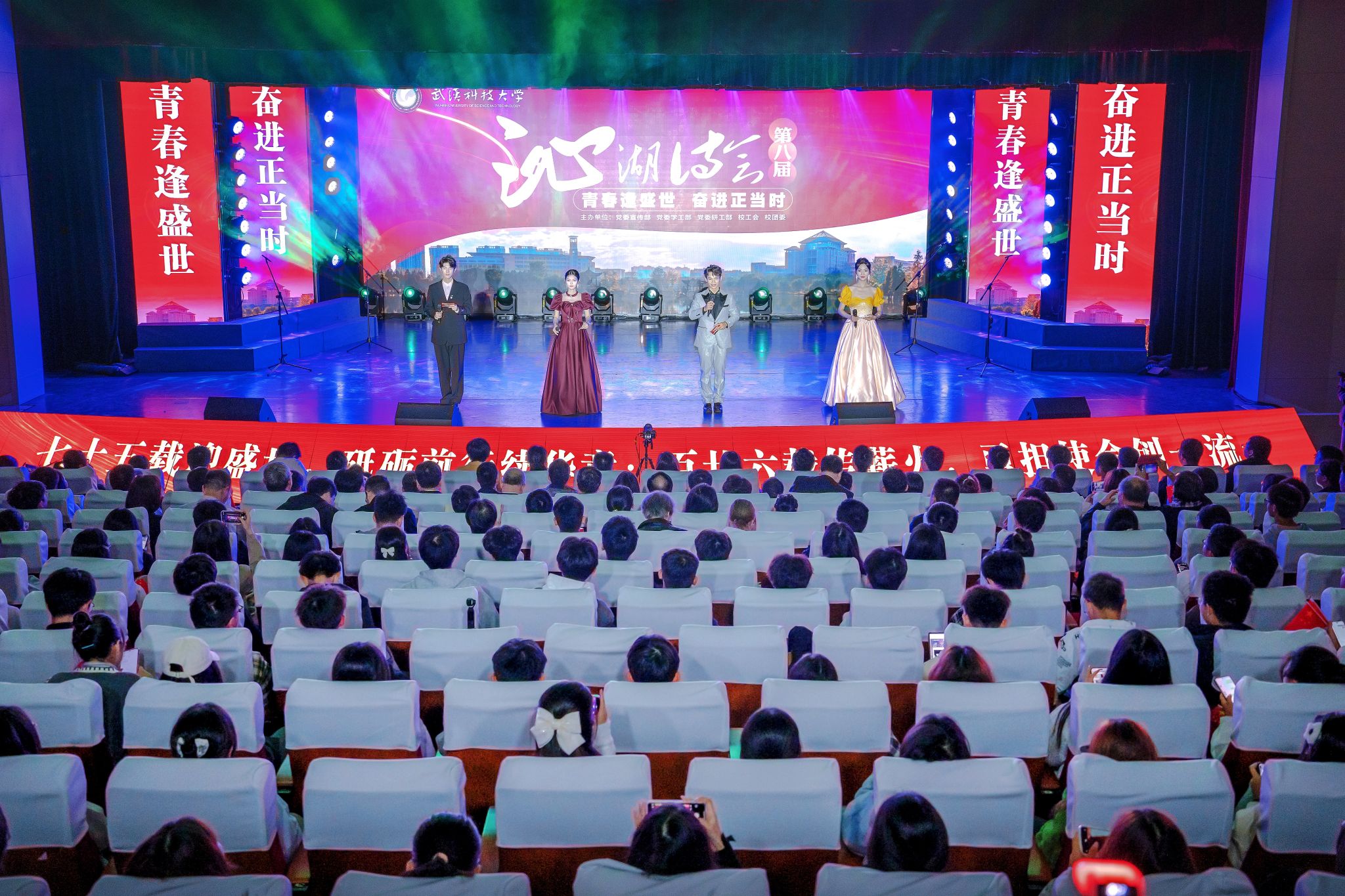 武科大网讯(记者邹逸凡 见习记者肖宇瑄 余蔓菲)10月27日晚,鸭脖第八届“沁湖诗会”在黄家湖校区沁湖礼堂举行。活动以“青春逢盛世 奋进正当时”为主题,以诗为媒的美育大思政课内容,突出学校学院特色,千余名师生用诗歌表演诠释鸭脖与时代共振的辉煌历程,立新时代青春报国志,献礼新中国成立75周年。