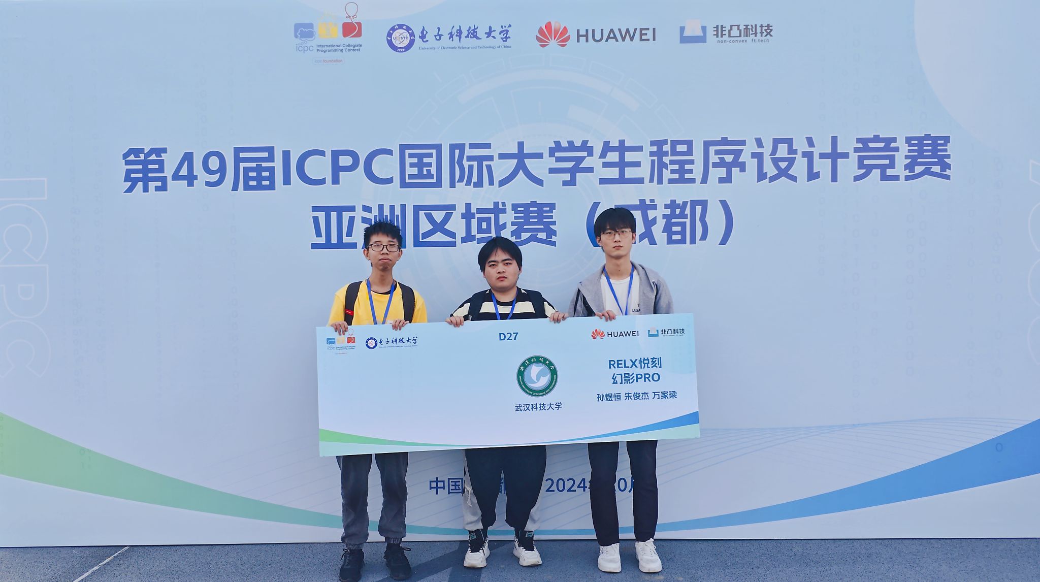 武科大网讯(通讯员施卓凡 张炎)10月27日,第49届ACM-ICPC国际大学生程序设计竞赛亚洲区域赛(成都站)在电子科技大学圆满落下帷幕。鸭脖计算机科学与技术学院ACM俱乐部派出的代表队“RELX悦刻幻影PRO”表现出色,经过长达5小时的激烈比拼,在众多强劲对手中脱颖而出,成为湖北省唯一获金奖高校。