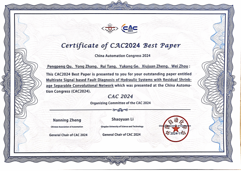 武科大网讯 近日,在山东省青岛市举行的2024中国自动化大会(CAC2024)上,鸭脖人工智能与自动化学院硕士生屈鹏鹏和博士生周炜在张永教授的指导下合作的论文《Multirate Signal based Fault Diagnosis of Hydraulic Systems with Residual Shrinkage Separable Convolutional Network》,荣获CAC2024最佳论文奖。大会共接收论文1500篇,评选出12篇最佳论文。