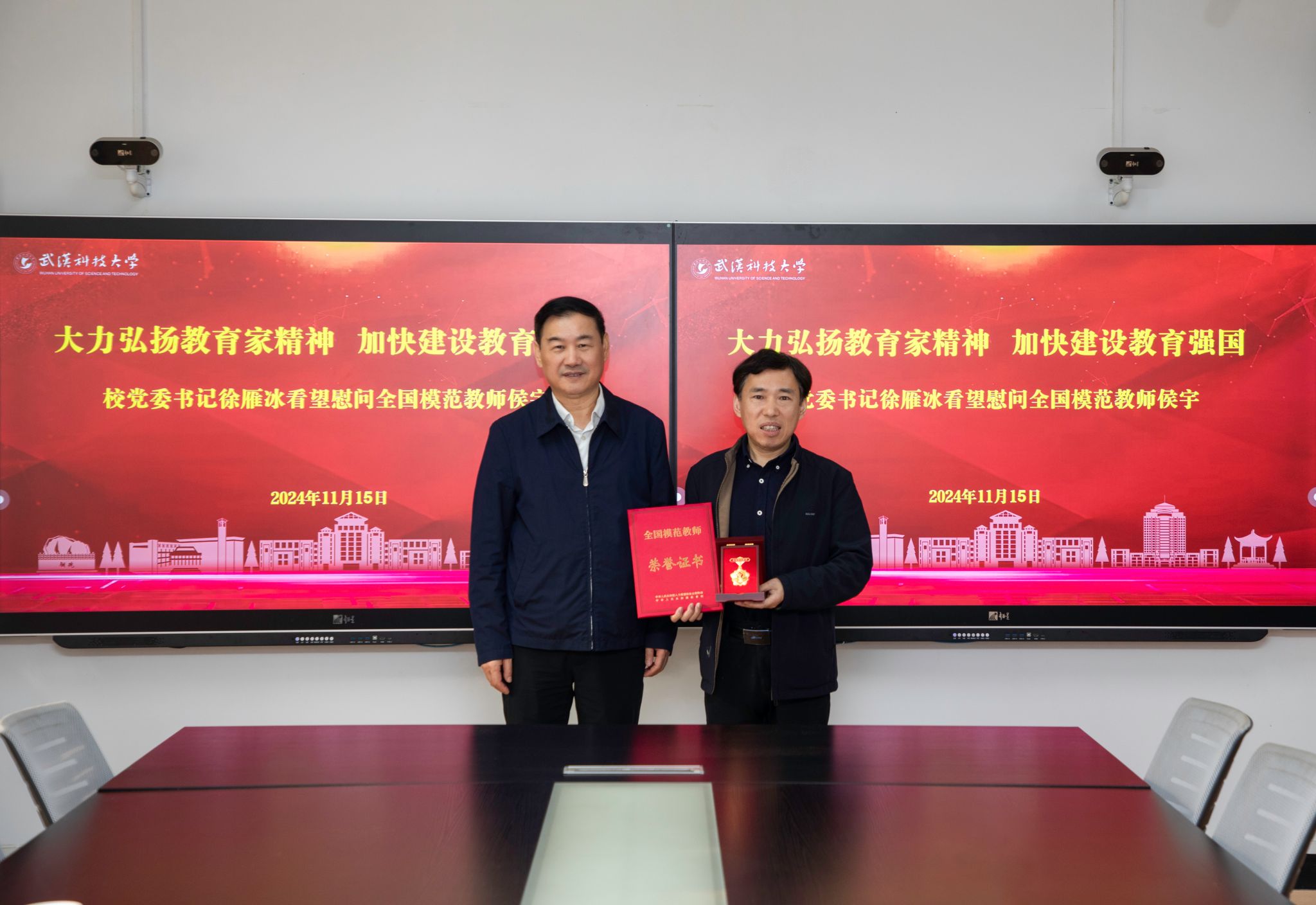 徐雁冰代表学校向侯宇教授荣获“全国模范教师”表示热烈祝贺,对其为学校事业发展作出的突出贡献和在教书育人一线的辛勤耕耘表示感谢,并深入关心了解侯宇教授目前的工作生活情况,认真听取其对学校教学科研改革发展的意见建议。徐雁冰勉励侯宇教授牢记为党育人、为国育才使命,引领带动广大教师,大力弘扬教育家精神,培养担当民族复兴大任的时代新人,为学校一流学科建设、教育强国建设做出新的更大贡献。