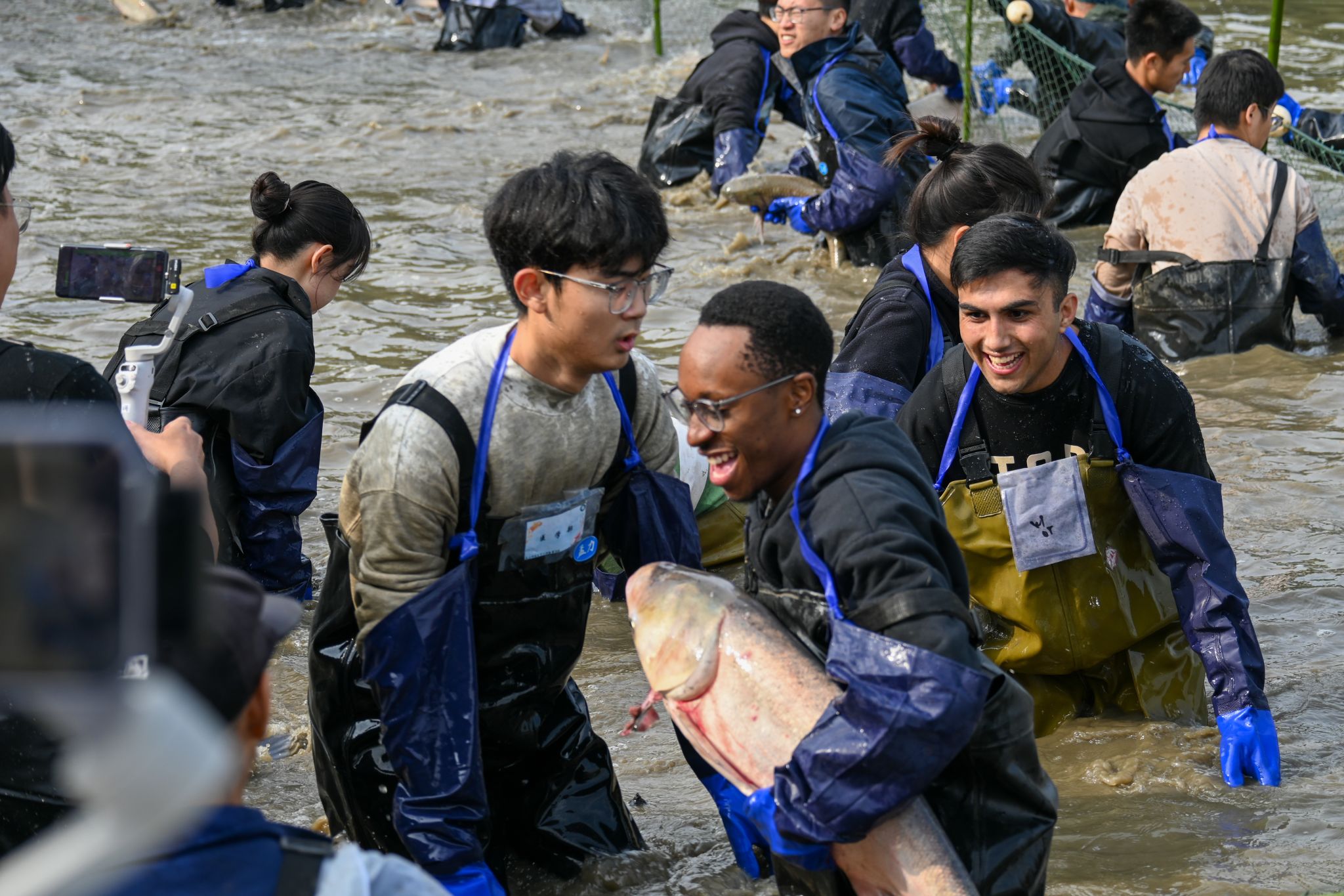 赞比亚留学生Chishimba Mutale已连续四年吃到了“沁湖鱼宴”的免费鱼肴,这是他第一次参与到拉网捕鱼的环节,“特别激动!感恩学校给我们这样的机会体验!”