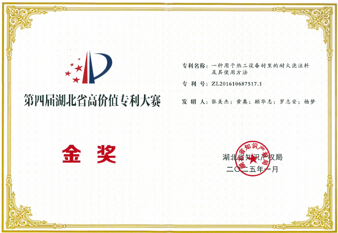 武科大网讯(通讯员张美杰) 1月21日,2025年全省知识产权局局长会议暨知识产权强省建设推进会召开,材料学部绿色功能耐火材料研究团队张美杰、黄奥、顾华志、罗志安、杨梦发明的专利《一种用于热工设备衬里的耐火浇注料及其使用方法》(专利号ZL201610687517.1)荣获第四届湖北省高价值专利大赛金奖,省属高校唯一。