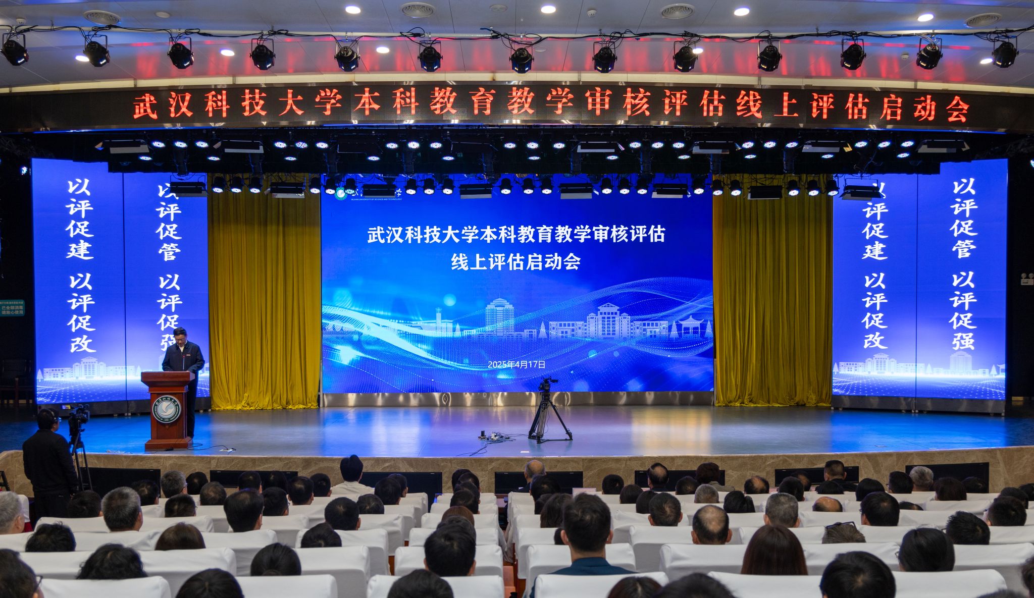 倪红卫以《以立德树人为根本,以学生发展为中心,着力培养具有“钢铁品质”的高素质人才》为题,从本科教育教学情况、自评自建开展情况、自评报告补充说明三个方面报告学校有关工作。他指出,近年来,学校立足高水平教学研究型大学建设,全面落实立德树人根本任务,秉持“学生中心、产出导向、持续改进”教育理念,构建多样化人才培养体系,着力培养具有“钢铁品质”的高素质人才。一是坚持五育并举,强化思想政治教育引领;二是实施综合改革,大力推进创新人才培养;三是加强双创教育,深化科教融汇产教融合;四是优化专业调整,促进人才培养供需适配;五是强化质量管理,健全教学质量保障体系。他表示,本轮审核评估工作开展以来,学校先后调研省内外数十所高校,全面复盘找差距,对标对表促提升,学校教学管理制度不断健全,教学设施环境不断改善,教学教研氛围不断浓厚;学校将以本轮评估为契机,对标一流、深化改革,持续提升教育教学水平,奋力推进学校一流本科教育迈上新台阶。