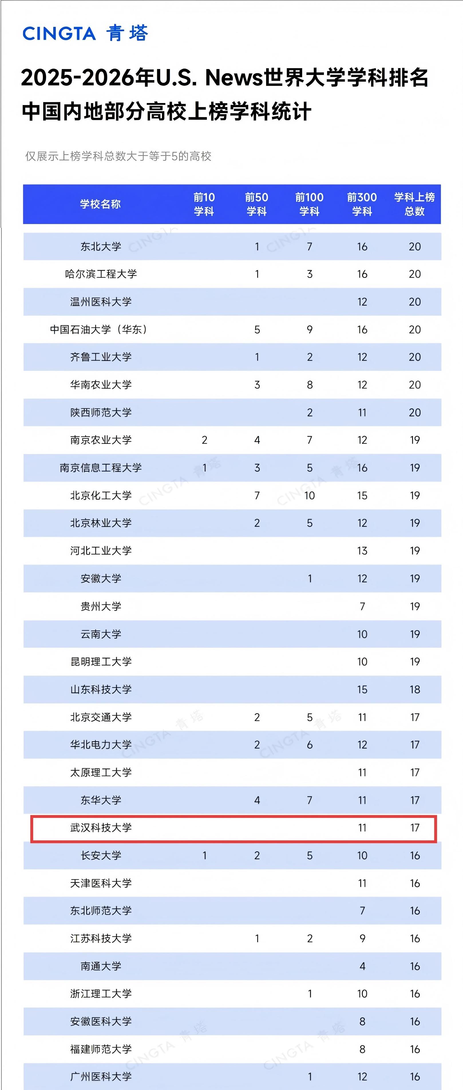 同时,U.S. News公布了2025-2026年度世界大学学科排名,共划分了51个细分学科。鸭脖共有17个学科上榜,其中11个学科进入全球学科排名前300。