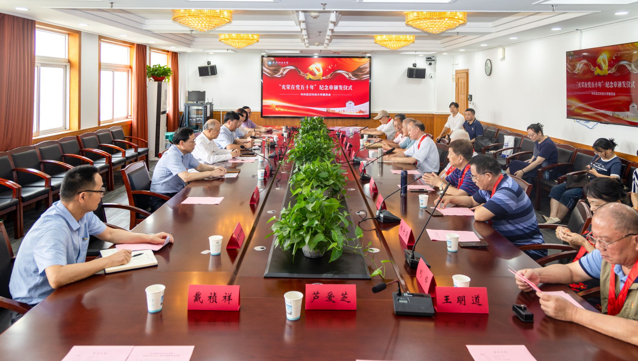 武科大网讯 6月26日上午,学校在青山校区主楼1610会议室举行2025年度“光荣在党50年”纪念章颁发仪式,为28位老党员颁发纪念章。校长倪红卫,校党委副书记沈季伟,党委常委、组织部部长刘时新出席仪式。仪式由沈季伟主持。