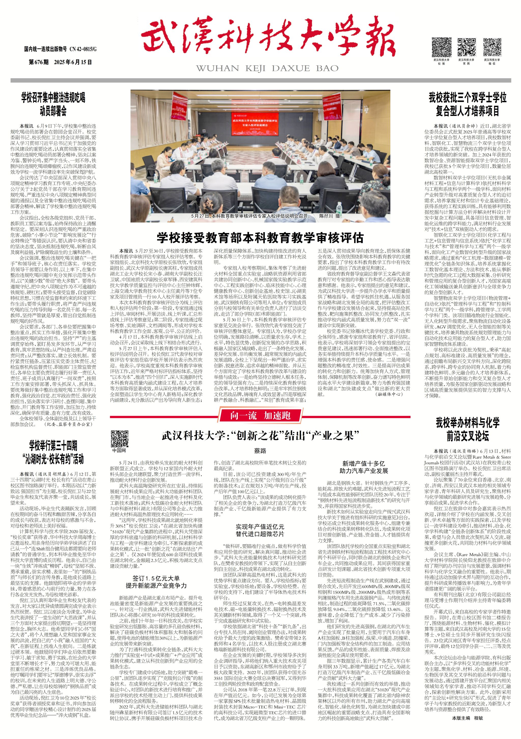 “这两年,学校科技成果湖北就地转化率提升30%!”校长倪红卫说:“在湖北省加快构建‘51020’现代产业集群的进程中,武科大凭借深厚的学科底蕴与创新的科研机制,以材料科学与工程一流学科建设为牵引,不断探索新的成果转化模式,让一批‘创新之花’在湖北结出‘产业之果’。仅2024年便促成600余项科技成果在湖北转化,金额超2.3亿元,积极为湖北支点建设贡献力量。”