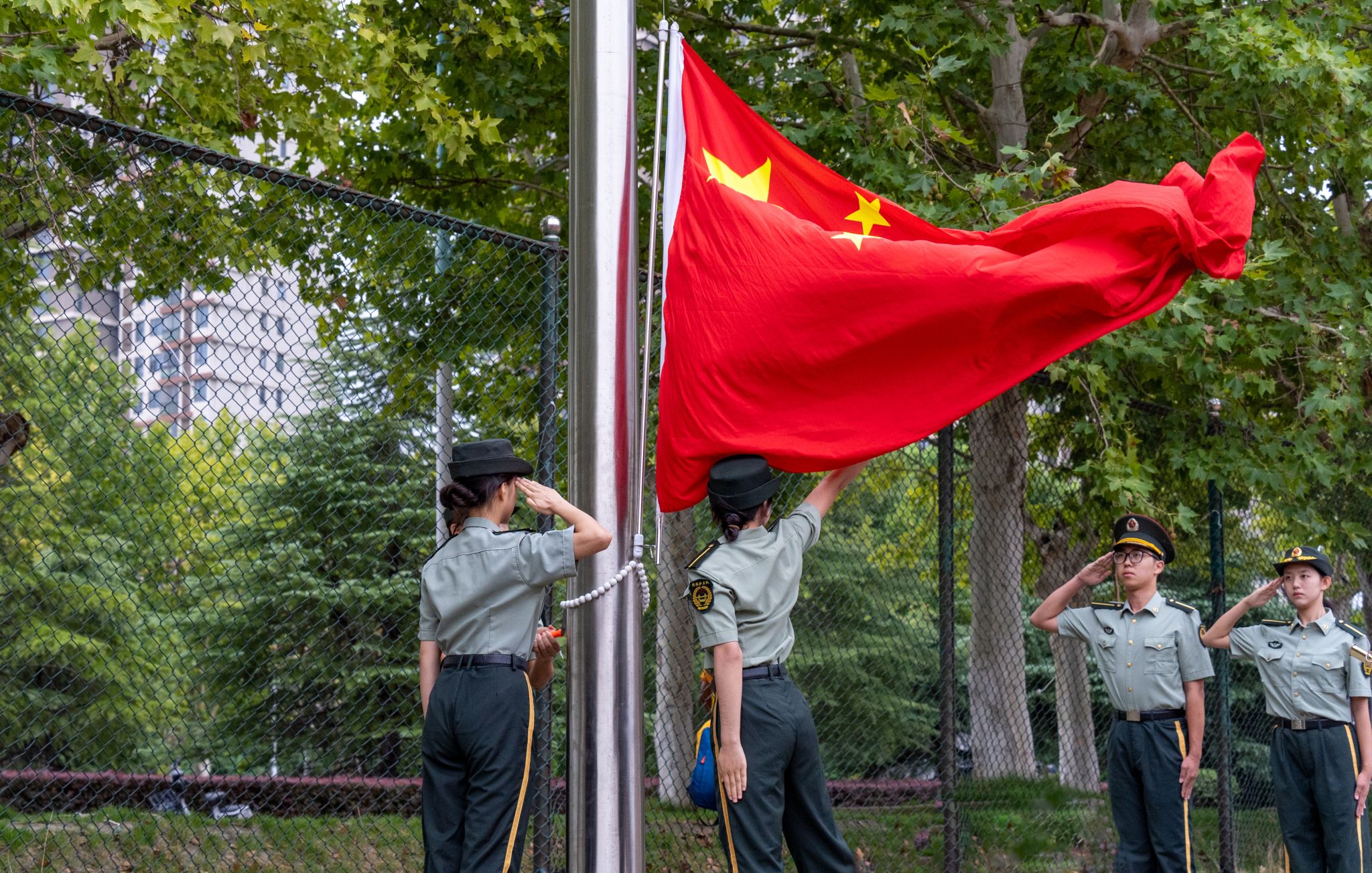 晨光熹微,国旗护卫队队员护卫着鲜艳的五星红旗,迈着铿锵有力的步伐走向升旗台。伴随着雄壮的《义勇军进行曲》,五星红旗冉冉升起,全体师生庄严肃立,高唱国歌,行注目礼。升旗礼毕,师生低头默哀,深切悼念在“九一八”事变中牺牲的革命先烈和遇难同胞。