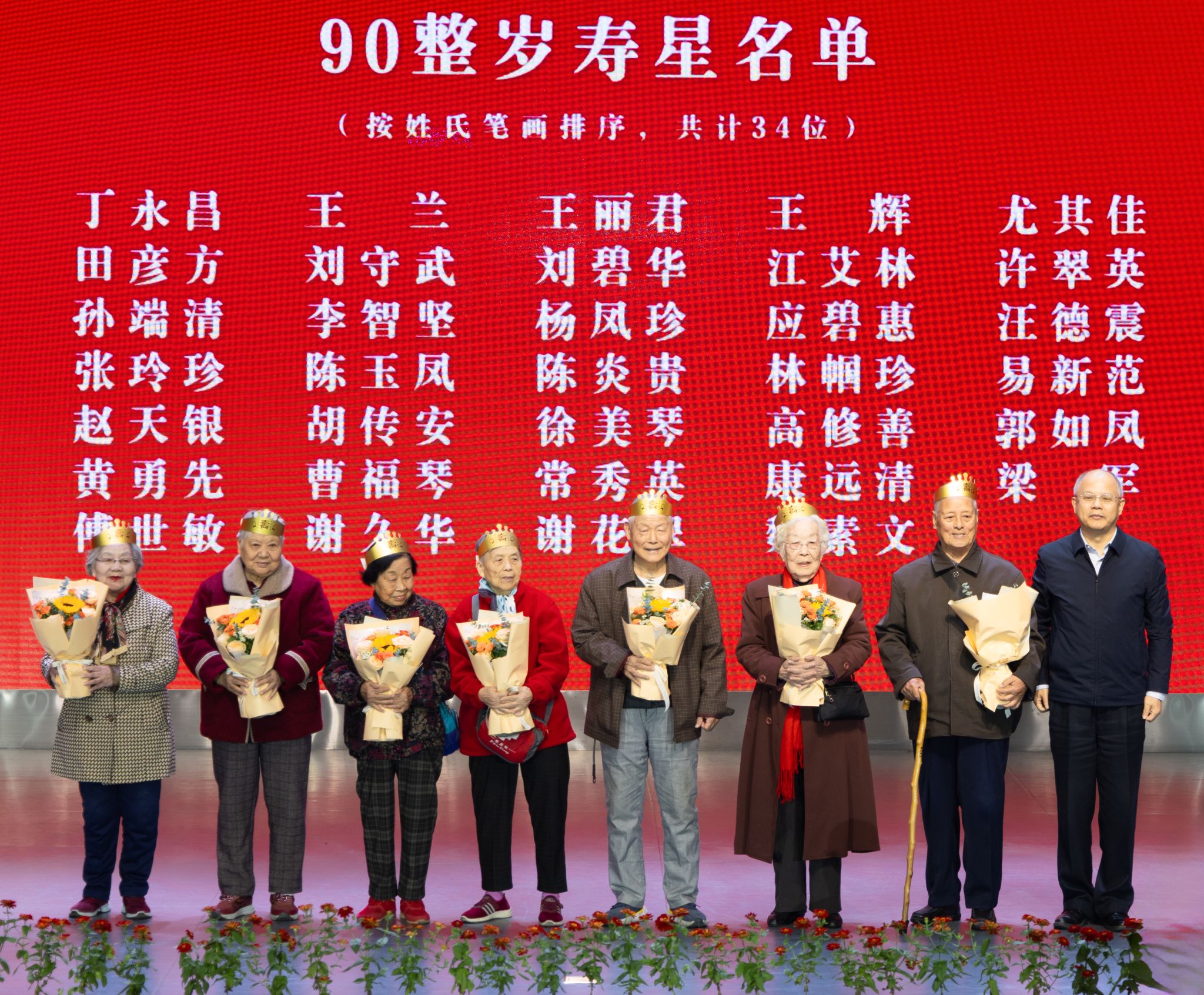 活动现场温情满溢,学校为70、80、90整岁的老寿星们举行了集体祝寿仪式。倪红卫、沈季伟、刘时新分别为寿星们送上生日祝福和慰问。