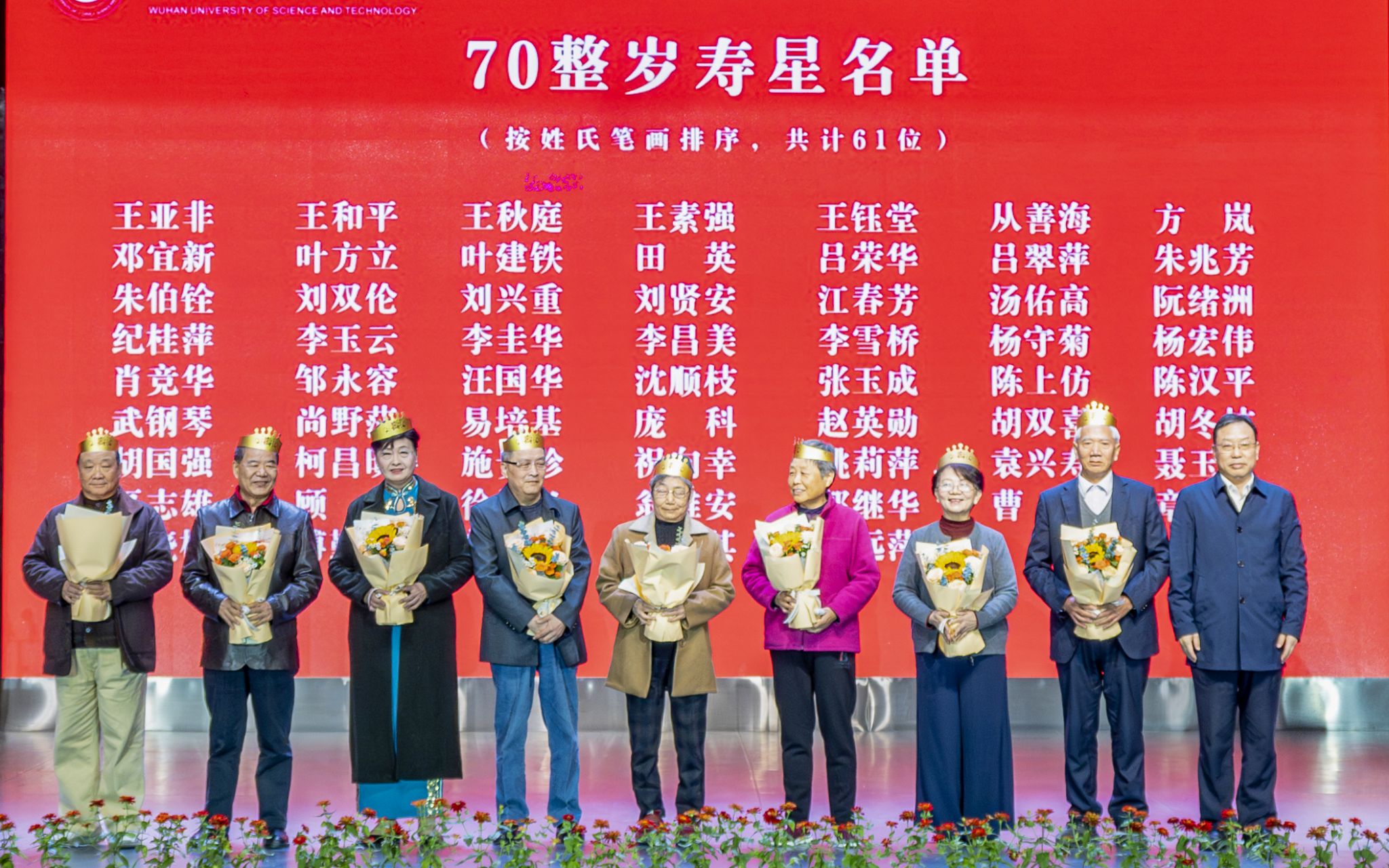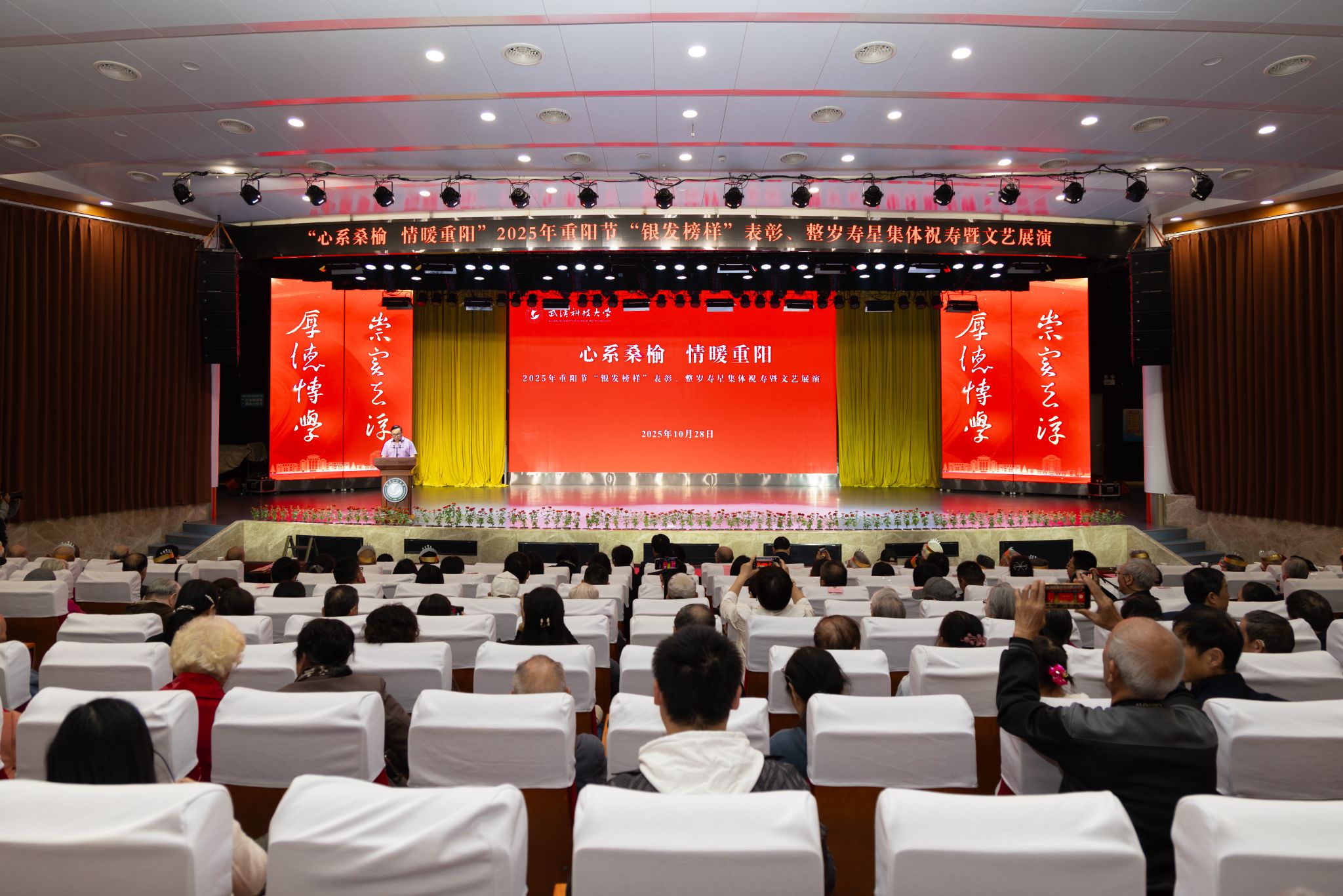 武科大网讯 10月28日上午,学校在青山校区碧园会堂举行“银发榜样”表彰仪式暨重阳节集体祝寿活动。校党委书记倪红卫、党委副书记沈季伟、党委常委刘时新与离退休老同志、老寿星们欢聚一堂,共庆重阳佳节。