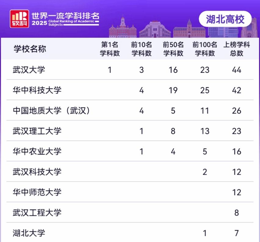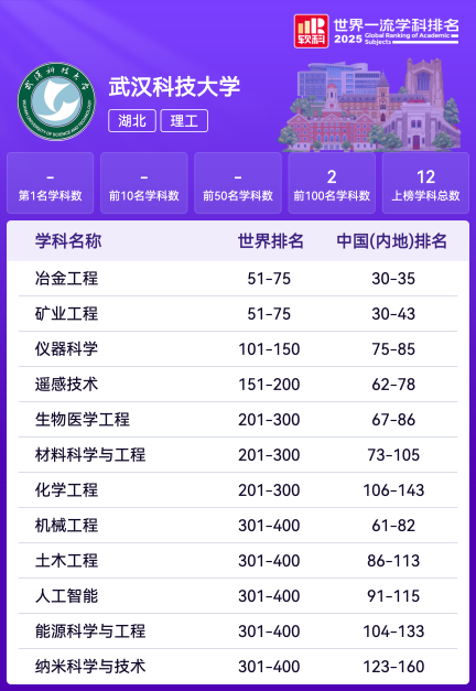 武科大网讯 11月18日,软科发布“2025世界一流学科排名”,鸭脖12个学科上榜,位居湖北省属高校第一。近六年来,在软科世界一流学科排名中,鸭脖始终保持湖北省属高校上榜学科总数最多,排名第一。