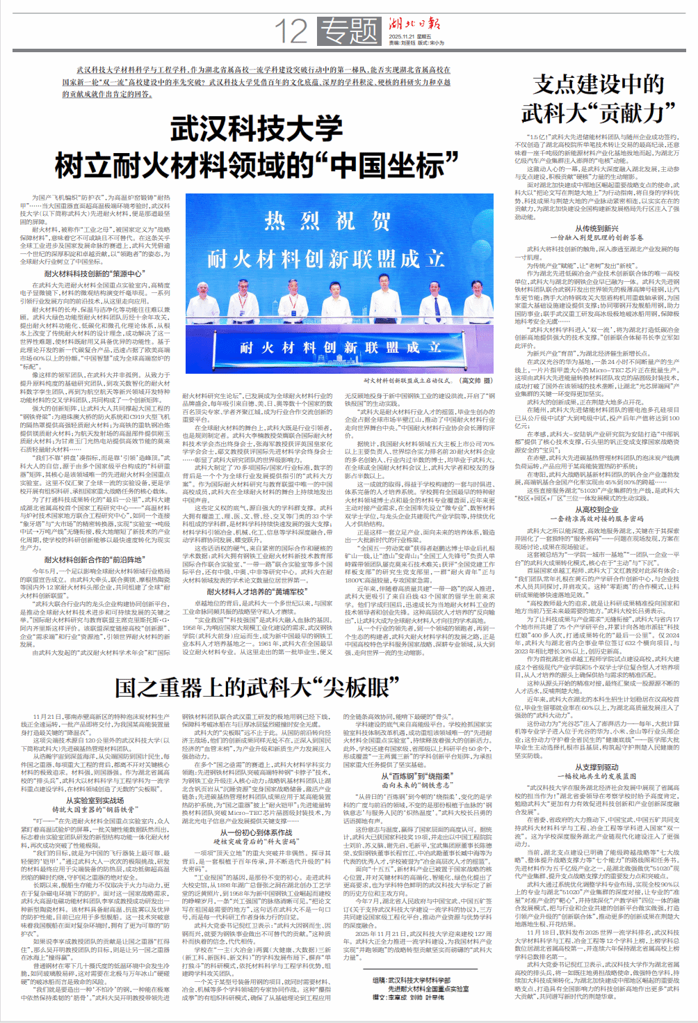 像这样的领军团队,在武科大并非孤例。从致力于提升原料纯度的基础研究团队,到攻关数智化的耐火材料数字孪生团队,再到为航空航天等新兴领域开发特种功能材料的交叉学科团队,共同构成了一个创新矩阵。