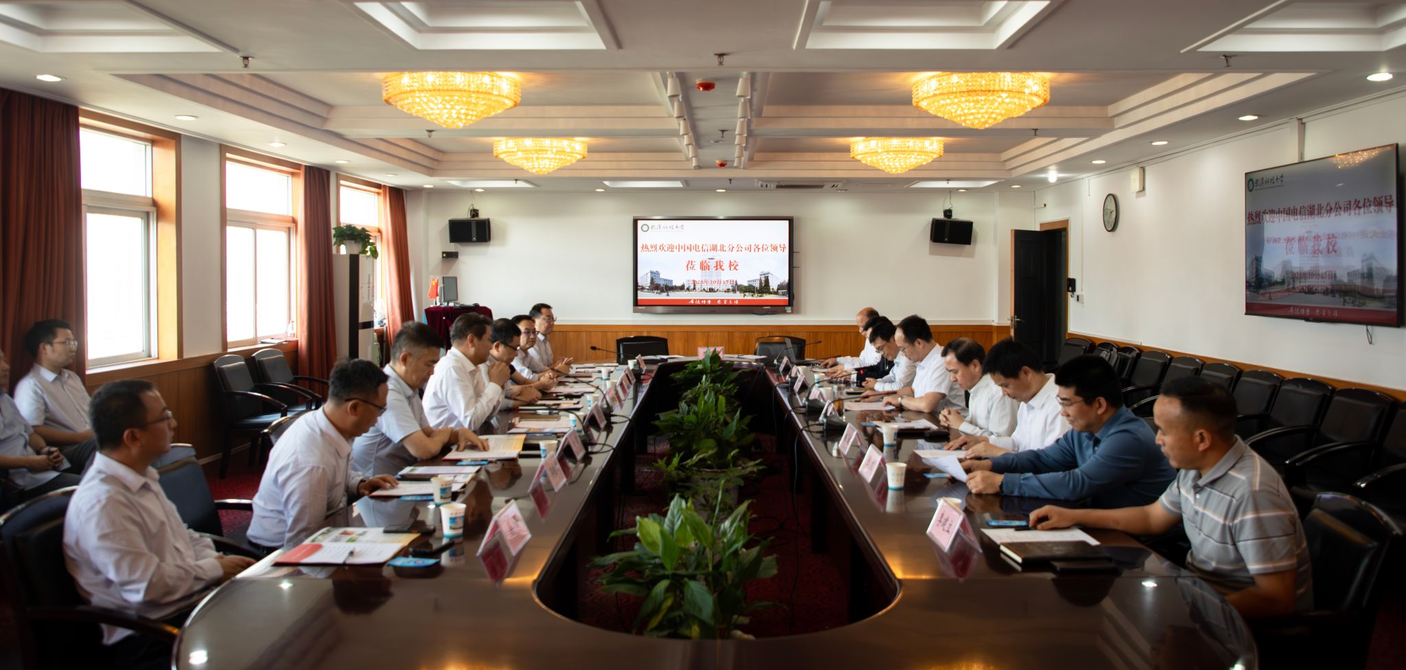 湖北电信政企信息服务事业群总经理李强、公众公司总经理周慧中、政企教育行业事业部总经理吴晓斌,武汉电信副总经理覃兵,武汉电信校园客户服务部总经理吴峰、副总经理周强,学校党政办公室、研究生院、科学技术发展院、校友工作与社会合作处、网络信息中心、计算机科学与技术学院负责人参加会议。
