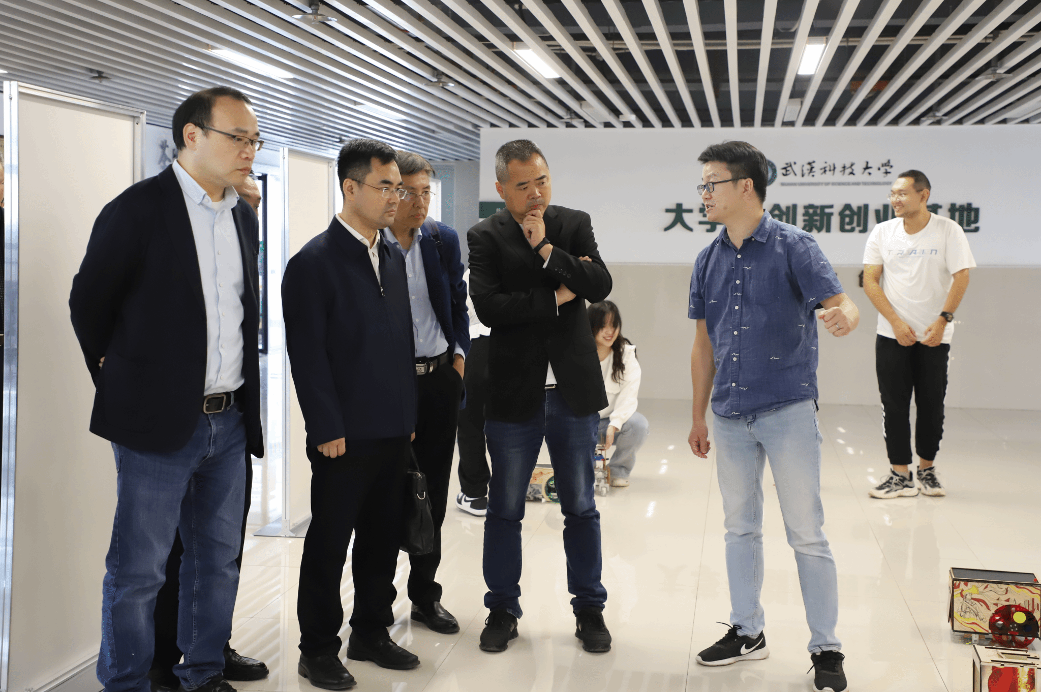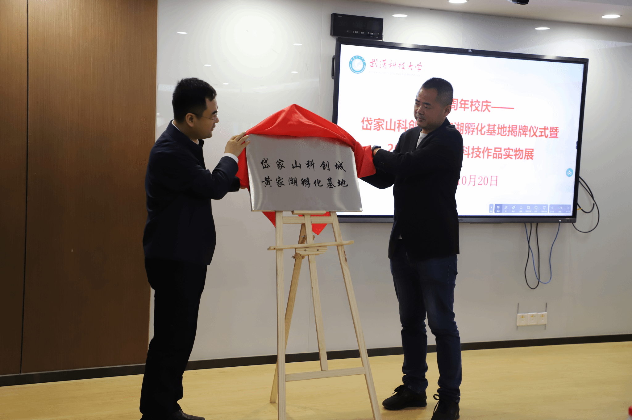 武科大网讯 10月20日下午,岱家山科创城黄家湖孵化基地揭牌仪式暨2023年大学生科技作品实物展在学校黄家湖校区创新创业学院举行。武汉岱家山兴城实业发展有限公司党总支书记严明与校党委常委胡剑为岱家山科创城黄家湖孵化基地揭牌。