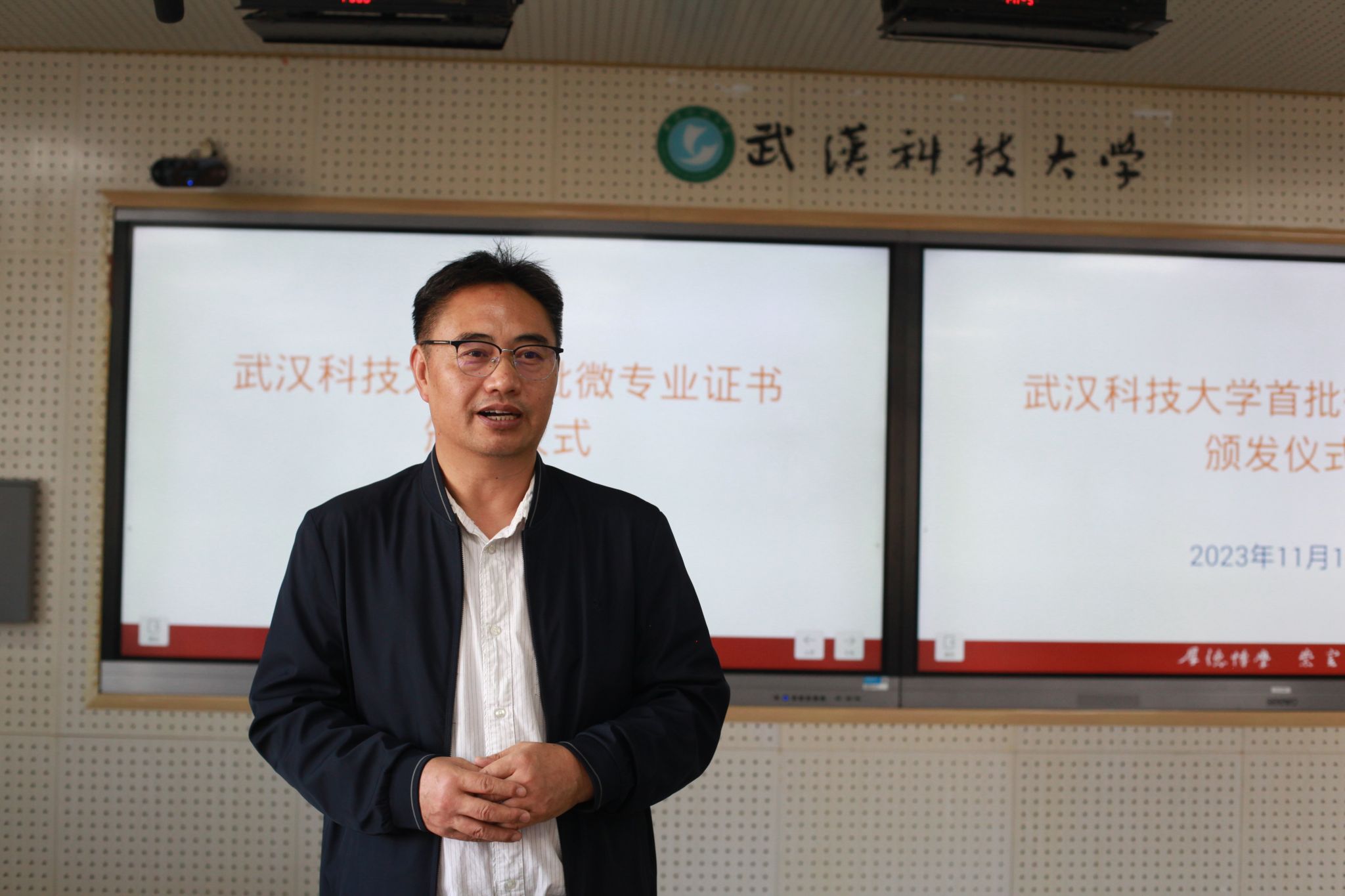 张志清作为鸭脖微专业项目的总策划人,分享了微专业项目在鸭脖的起源和发展过程。他强调,经过不断的探索与改进,微专业项目逐步得到了完善和提升,项目的影响力不断扩大,微专业项目赋能的“传统专业+”和复合型人才培养已初见成效,鸭脖在微专业项目上的成功经验和示范效应也为其他高校提供了借鉴和参考。首批微专业证书获得者是鸭脖微专业项目从无到有全过程的参与者和见证者,共同开创了武科大多样化育人新的篇章。