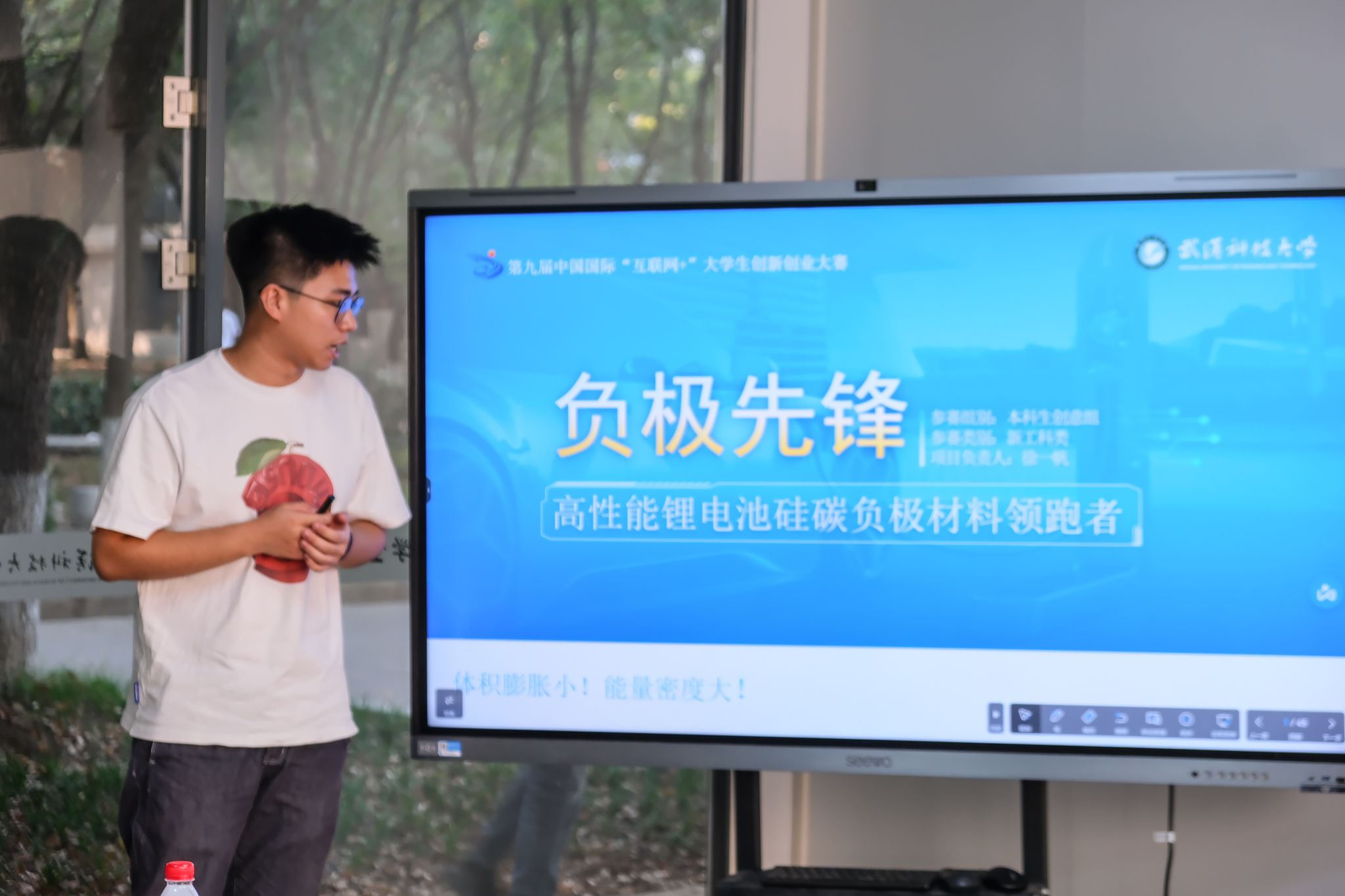 四只团队学生代表依次上台展示团队成果。胡晓明介绍了控温“核芯”,用中国科技引领全球热电产业新纪元;“安全第一,预防先行”;黄良慧讲述了边坡预灾在维护社会安全的重要作用,展现了科技造福人类,创新成就未来;徐一帆团队针对商用石墨负极容量低的痛点,提出高容量、低膨胀硅基材料是电池能量密度提升的有限解决方案,突出了教育、科技、人才三位一体的理念;陈敦熙团队致力于矿山固废治理,改善矿区乡村环境,推动了可持续发展。