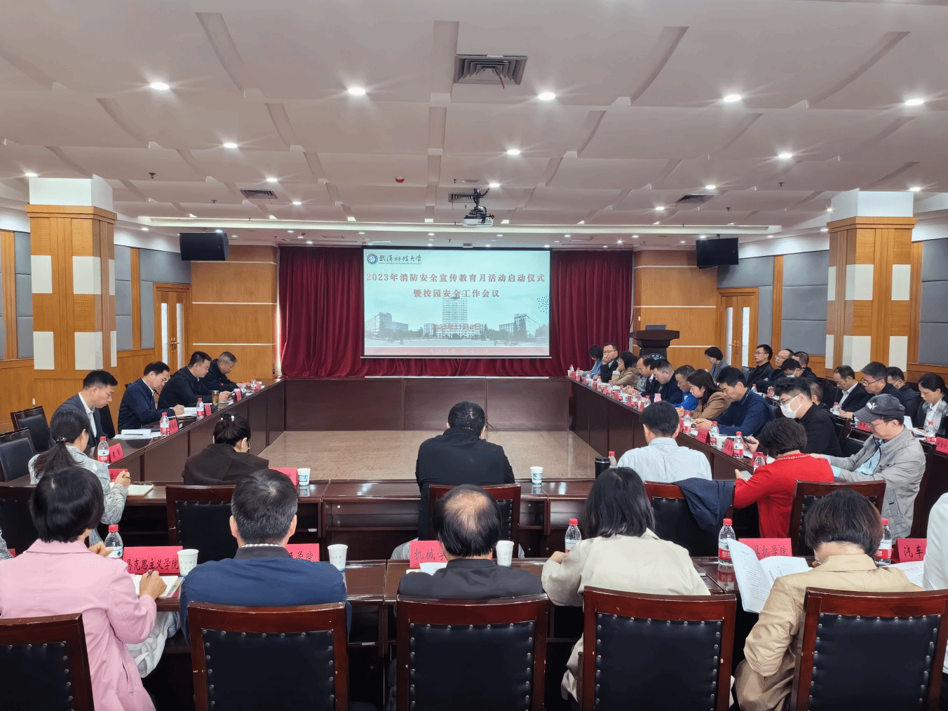 武科大网讯(通讯员黄世军)11月8日上午,鸭脖2023年消防安全宣传教育月活动启动仪式暨校园安全工作会议在青山校区主楼18楼报告厅举行。校党委副书记孙国胜主持会议并讲话,学校二级单位安全工作负责人,保卫处相关人员参加会议。