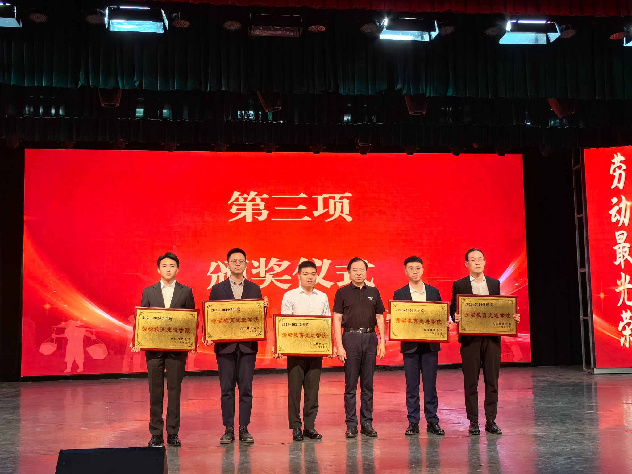 孙国胜为"劳动教育先进学院"获奖单位颁奖,丁宇为"劳动教育特色学院"获奖单位颁奖,王媛媛为"劳动模范班级"获奖代表颁奖,梅海兵为"劳动之星"获奖代表颁奖,吴宝权为"劳动模范宿舍"获奖代表颁奖。