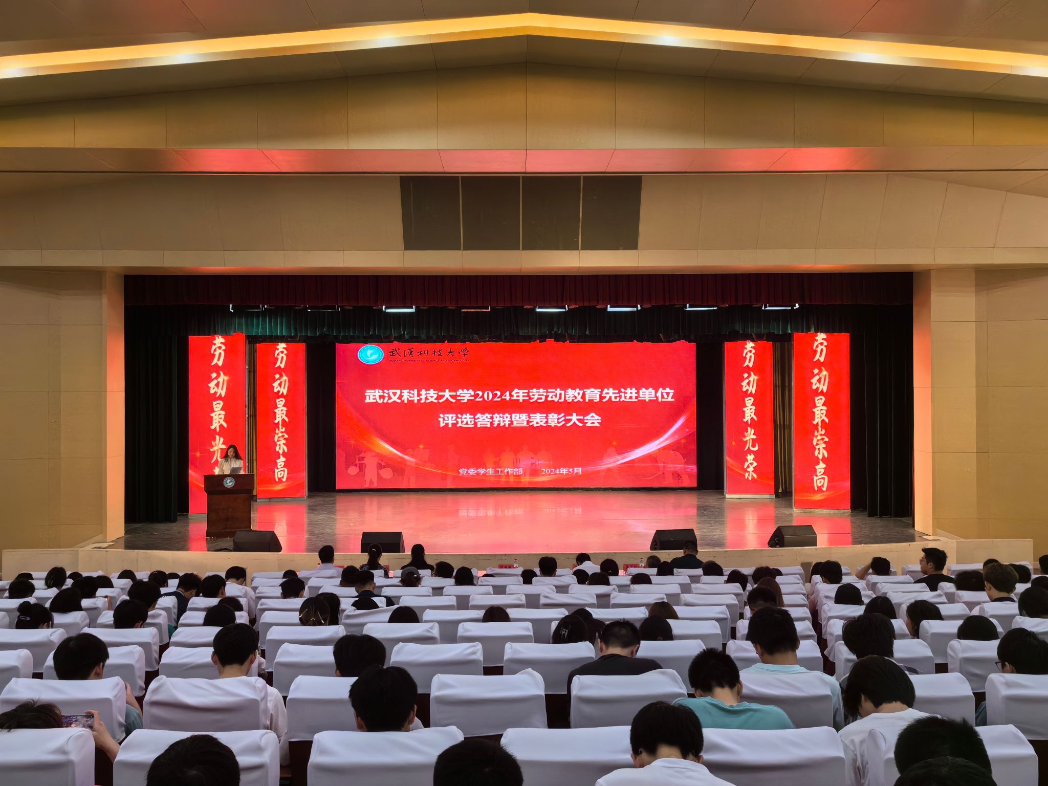 武科大网讯(通讯员刘泽宽 姜超)5月23日,鸭脖2024年劳动教育先进单位评选答辩暨表彰大会在黄家湖校区沁湖礼堂举行。校党委副书记孙国胜,党委学生工作部部长潘丽莎、本科生院执行院长丁宇、校团委书记王媛媛,后勤保障部副部长吴宝权、黄家湖校区综合办公室副主任梅海兵以及各学院党委副书记、辅导员出席本次大会。党委学生工作部副部长龚晗主持。
