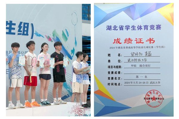 武科大网讯(通讯员平洋)5月24-26日,2024年湖北省普通高等学校(学生组)羽毛球比赛在武汉大学举行,鸭脖学生获甲组混合双打冠军。