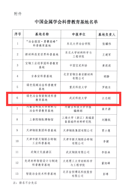 武科大网讯 近日,中国金属学会发布了《关于认定中国金属学会科普教育基地的通知》,认定13家单位(机构)为中国金属学会科普教育基地,鸭脖工程实践创新中心申报的 “绿色冶金智能制造科普基地”成功入选。