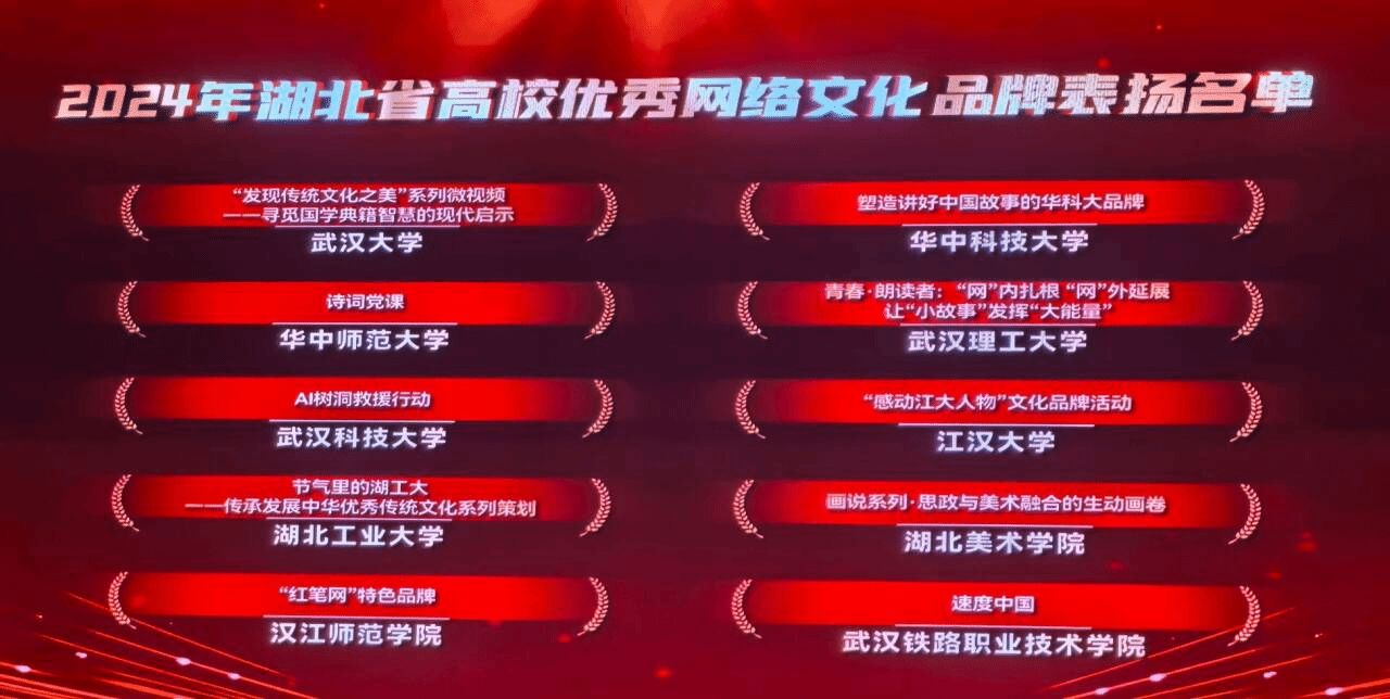 武科大网讯(通讯员 方钟明)12月10日,由湖北省委宣传部(省文明办)指导,省委网信办、团省委、省教育厅主办,华中科技大学承办的主题为“网聚长江文明力量 绽放荆楚文化风采”2024年湖北省高校优秀网络文化成果集中宣传展示活动举行。鸭脖计算机科学与技术学院选送的网络文化品牌项目“AI树洞救援行动”上榜湖北省高校优秀网络文化品牌表扬名单,学校作为表现突出工作单位受到表扬。