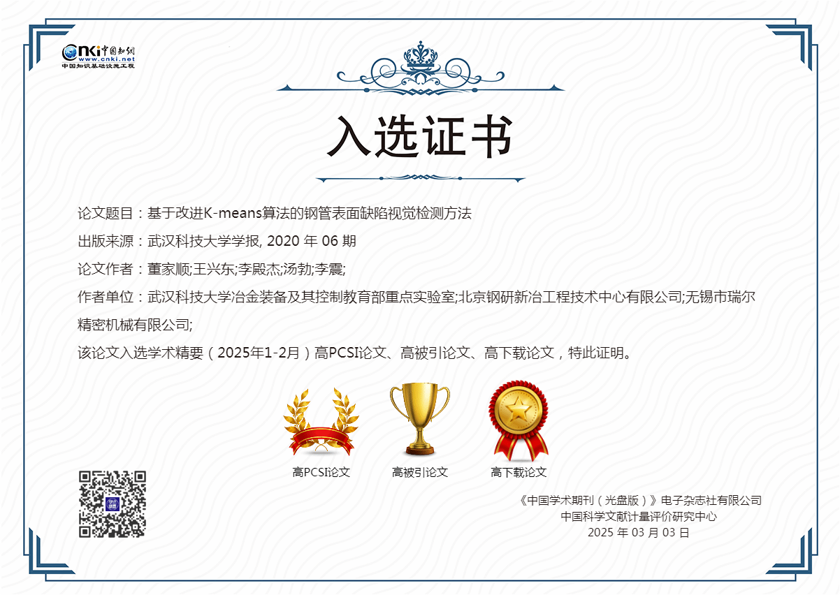 武科大网讯 近日,中国知网学术精要2025年度1-2月期"高影响力论文"评选结果揭晓,《yabo鸭脖官网学报》《yabo鸭脖官网学报(社会科学版)》38篇论文入选。其中《基于改进K-means算法的钢管表面缺陷视觉检测方法》等3篇论文实现“三高”指标全突破(同时满足高PCSI、高被引、高下载),“双高”论文(满足高PCSI、高被引、高下载其中之二)4篇,另有高PCSI论文5篇、高被引论文6篇、高下载论文20篇。