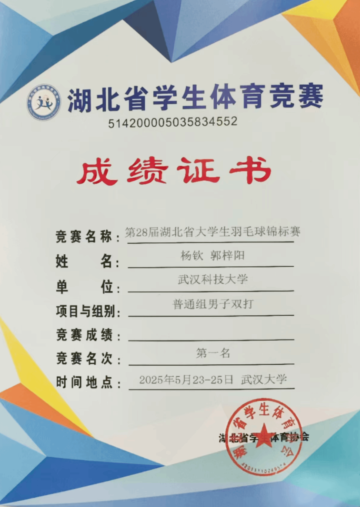 武科大网讯 5月23日至25日,第28届湖北省大学生羽毛球锦标赛在武汉举行。在这场汇聚全省高校羽坛精英的赛事中,鸭脖学子郭梓阳、杨钦凭借精湛球技与顽强斗志,摘得普通学生组男子双打冠军,为学校赢得荣誉。