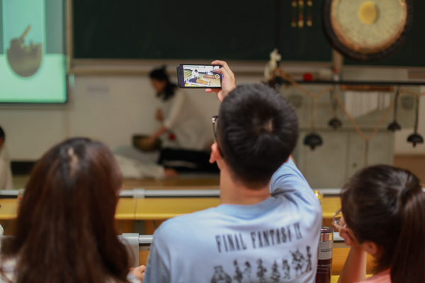 学生体验击钵 刘靖瑶摄