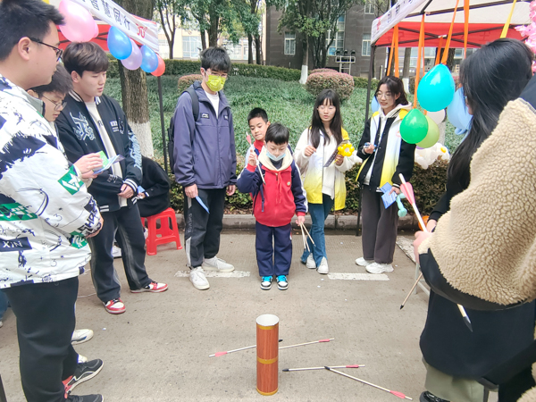 志愿者陪同小朋友参与投壶小游戏 王忠良摄