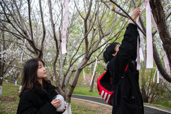 情侣在樱花树上绑祈愿丝带 杨佳伟摄