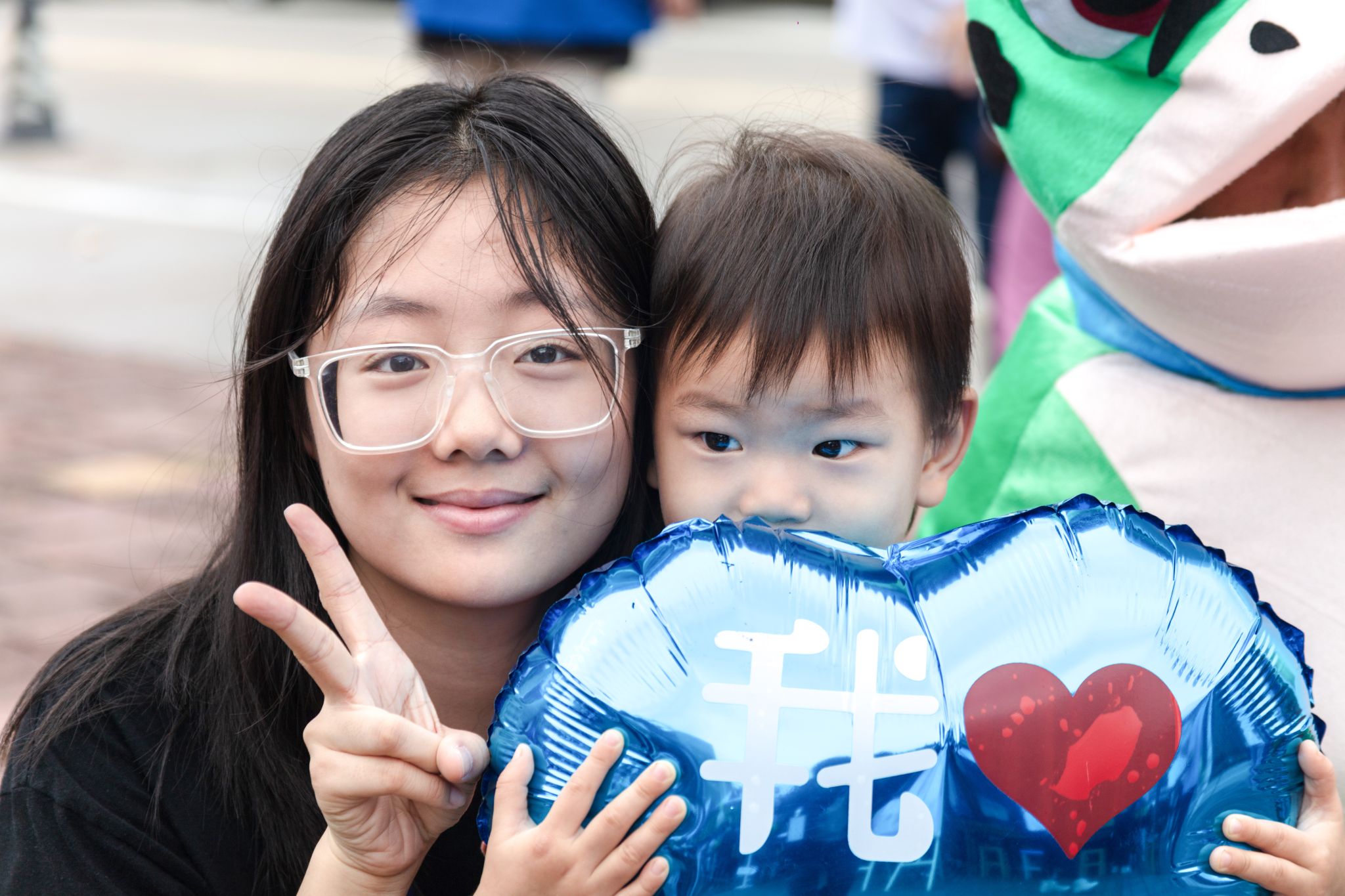 迎新志愿者与陪同报道的小朋友合影留念 杨佳伟摄