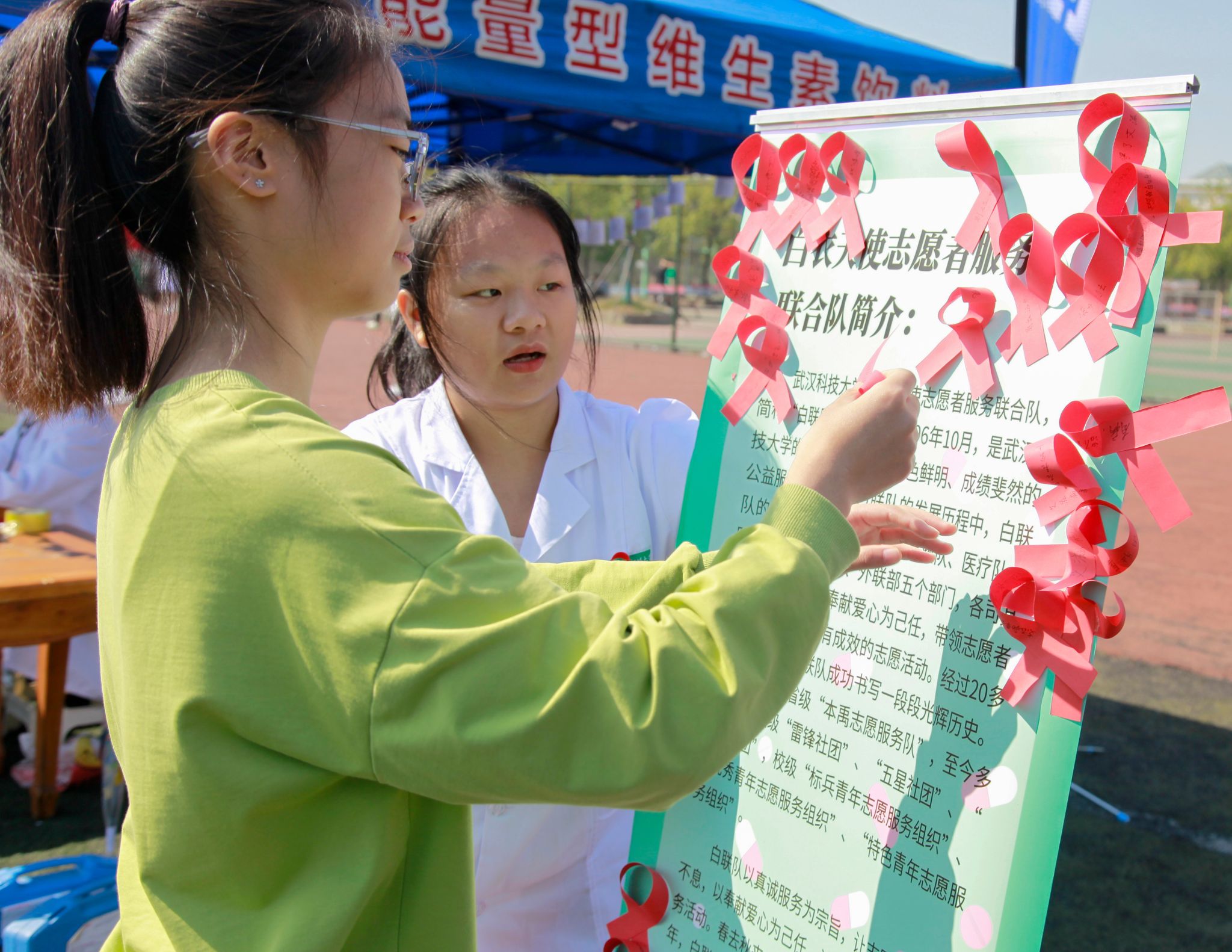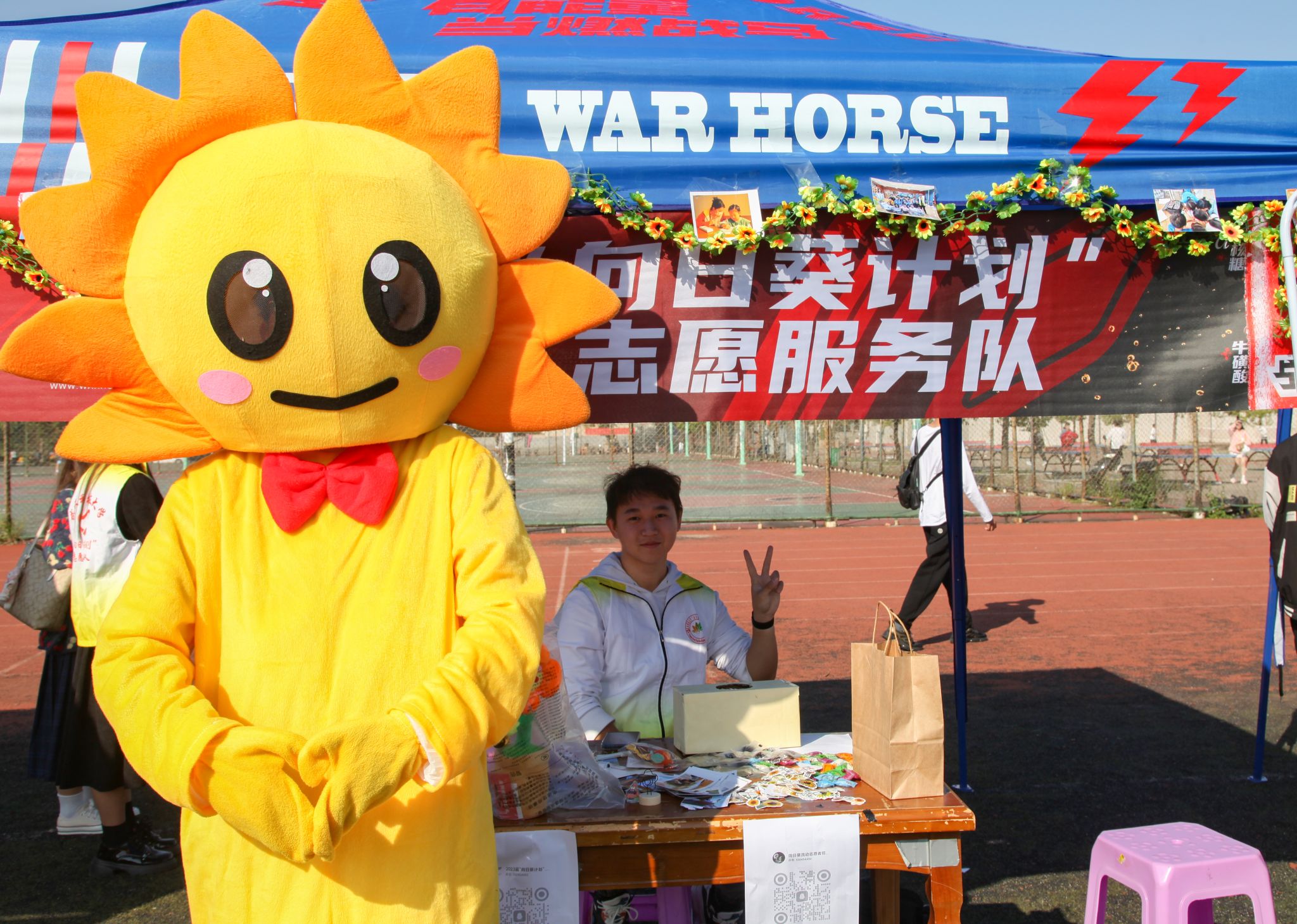 ”向日葵计划“志愿服务队帐篷上贴的志愿活动照片 郭劼摄