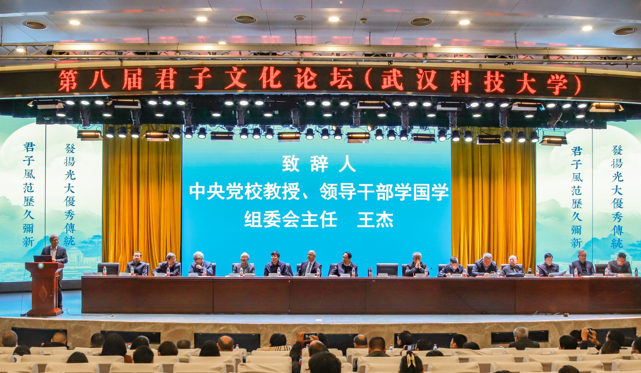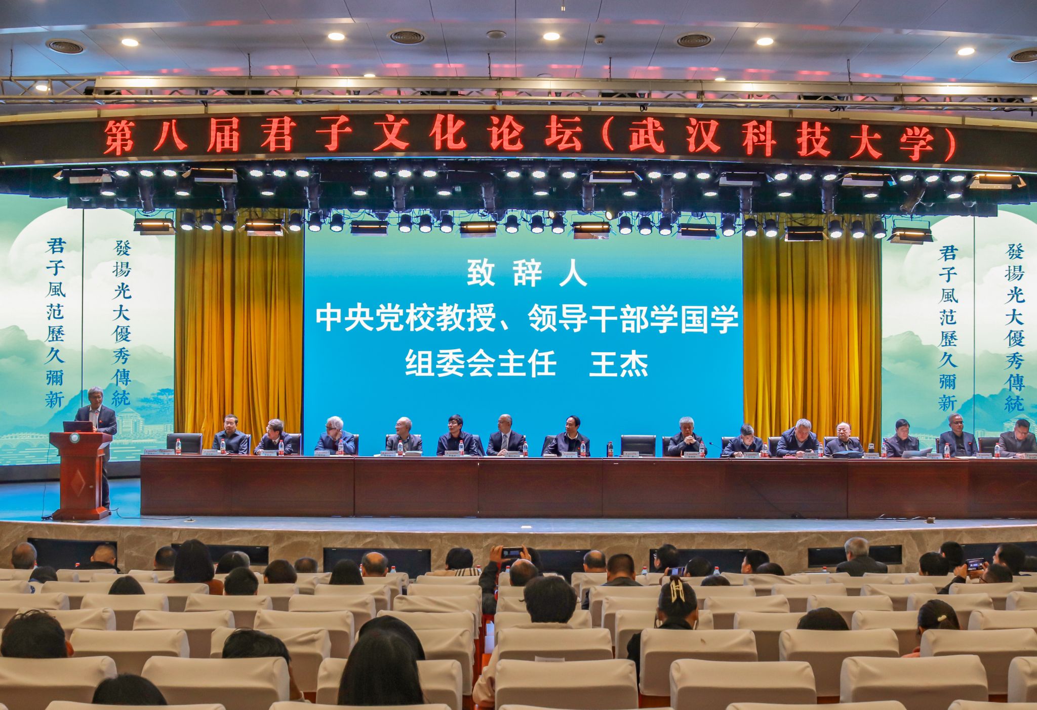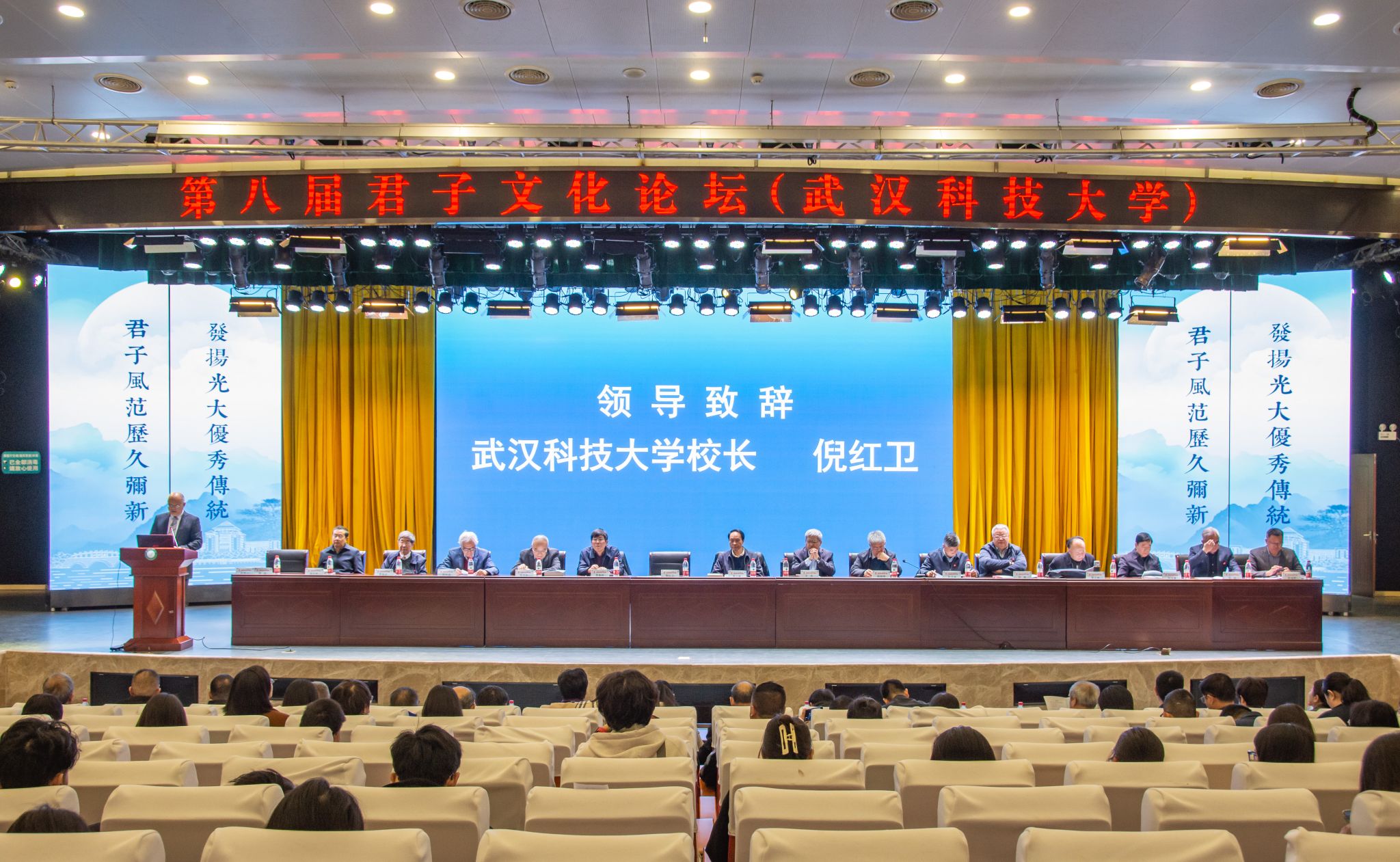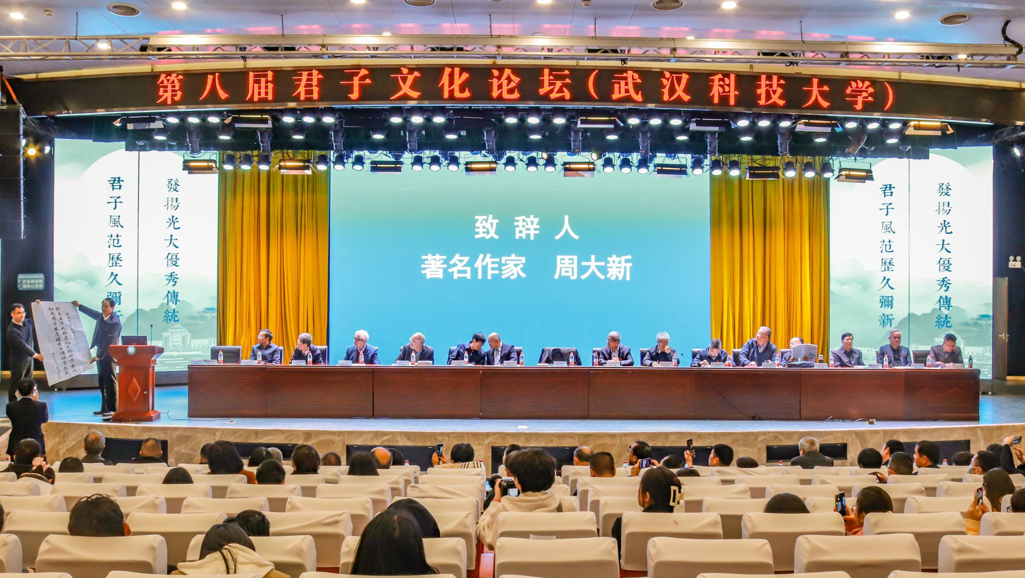 君子风范历久弥新,发扬光大优秀传统。11月11日,第八届君子文化论坛开幕式在鸭脖青山校区钢铁楼碧园会堂召开,本次论坛讨论的主题为“君子文化的知与行”。来自全国高校、科研院所、君子文化研究机构的专家学者和鸭脖师生300余人齐聚一堂,共话君子文化传承与创新。校长倪红卫,光明日报社原副总编辑李春林,著名作家周大新,中央党校教授、中国实学研究会会长王杰出席开幕式并致辞。校党委常委胡剑主持开幕式。