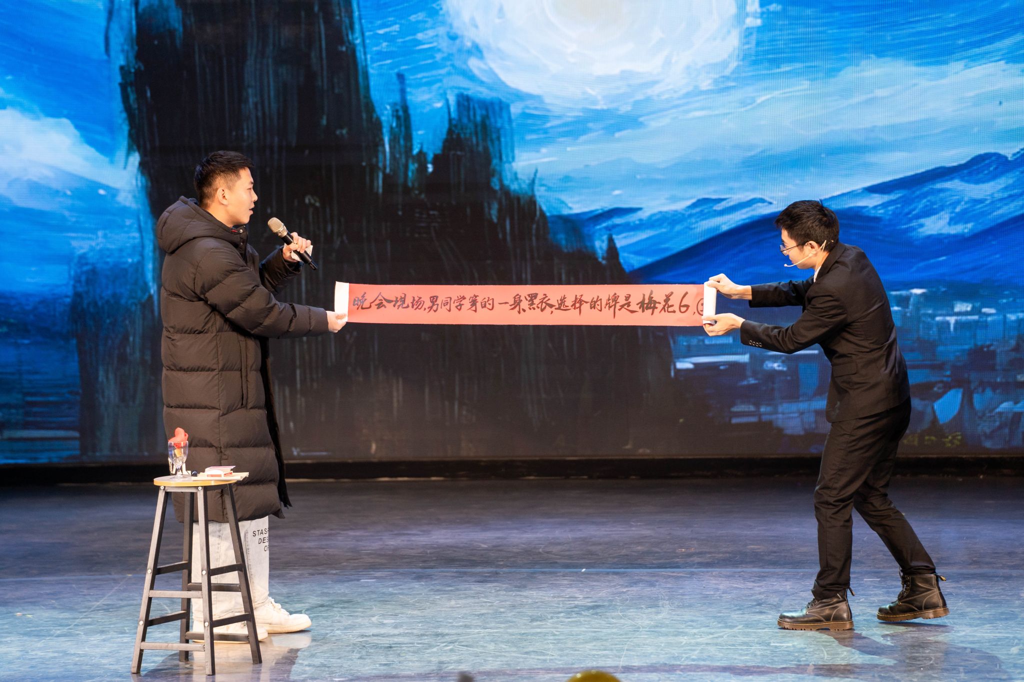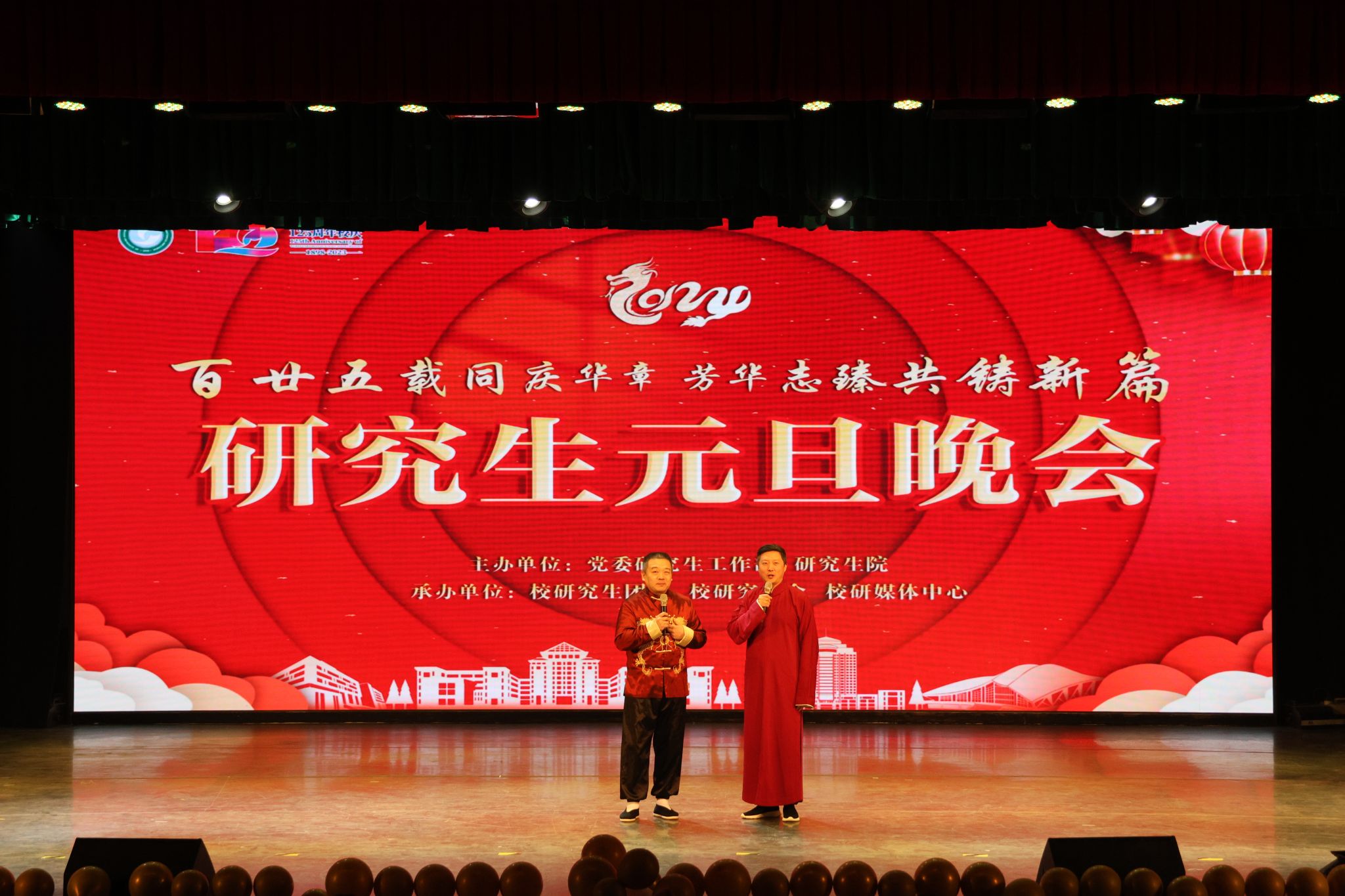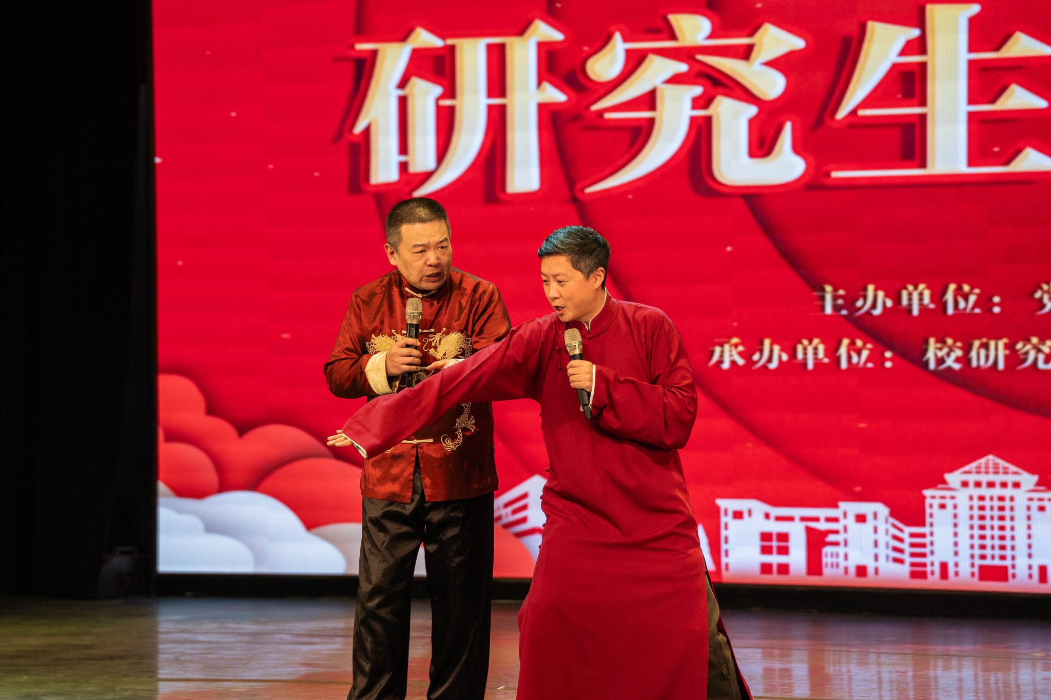 研究生各培养单位、研究生舞蹈队、武汉说唱团、大学生艺术团以及魔术协会共同为现场观众带来精彩纷呈的晚会节目。快板《比》、歌曲《星星》、舞蹈串烧《Hot Issue》《Hype Boy》 《Mix Pop》将晚会引入高潮。晚会设置多轮抽奖和互动环节,赵凯、冯涛、毛宝胜作为抽奖嘉宾为现场观众抽取奖品。音乐声、欢笑声、喝彩声交织在一起,形成了一曲欢乐的交响乐,现场观众都沉浸在欢愉的氛围中。