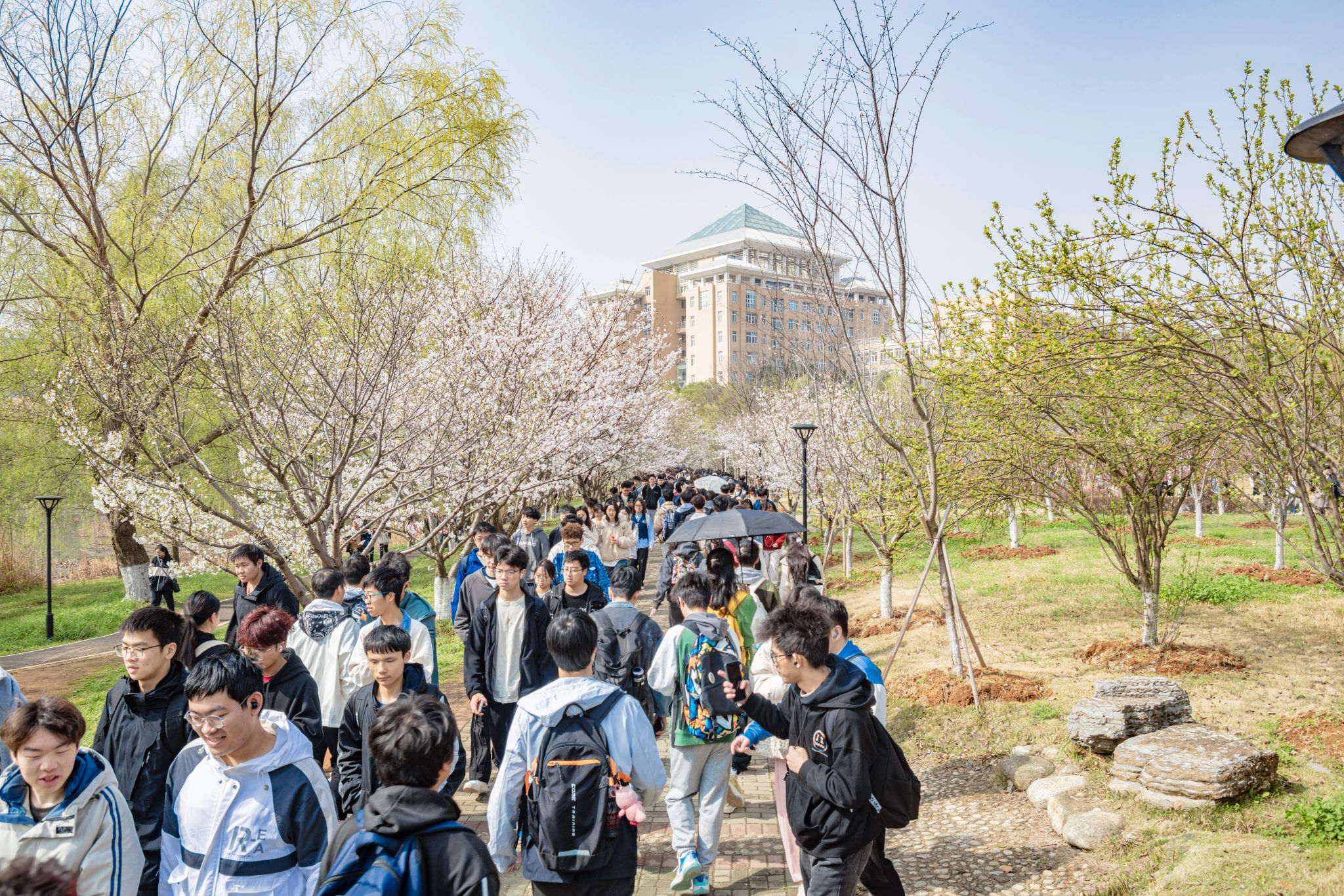 春分时节,占地两万余平方米的樱花树在鸭脖黄家湖校区应季而开,师生们沐浴着春日阳光沿着樱花大道赏樱,不少同学来到樱花树下拍照留念,现场热闹非凡。